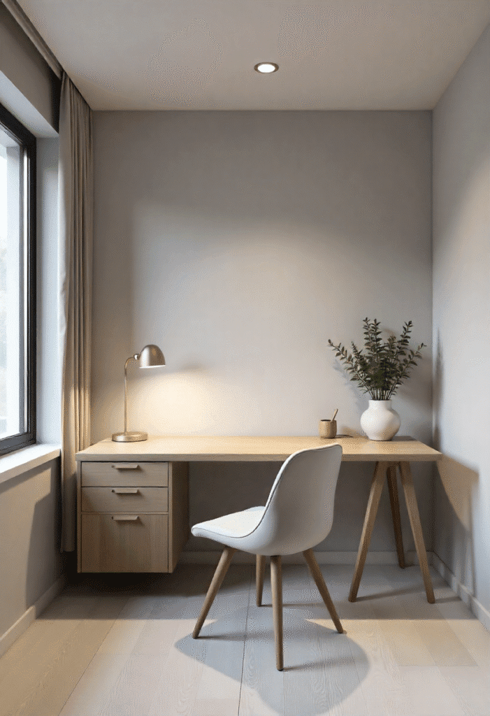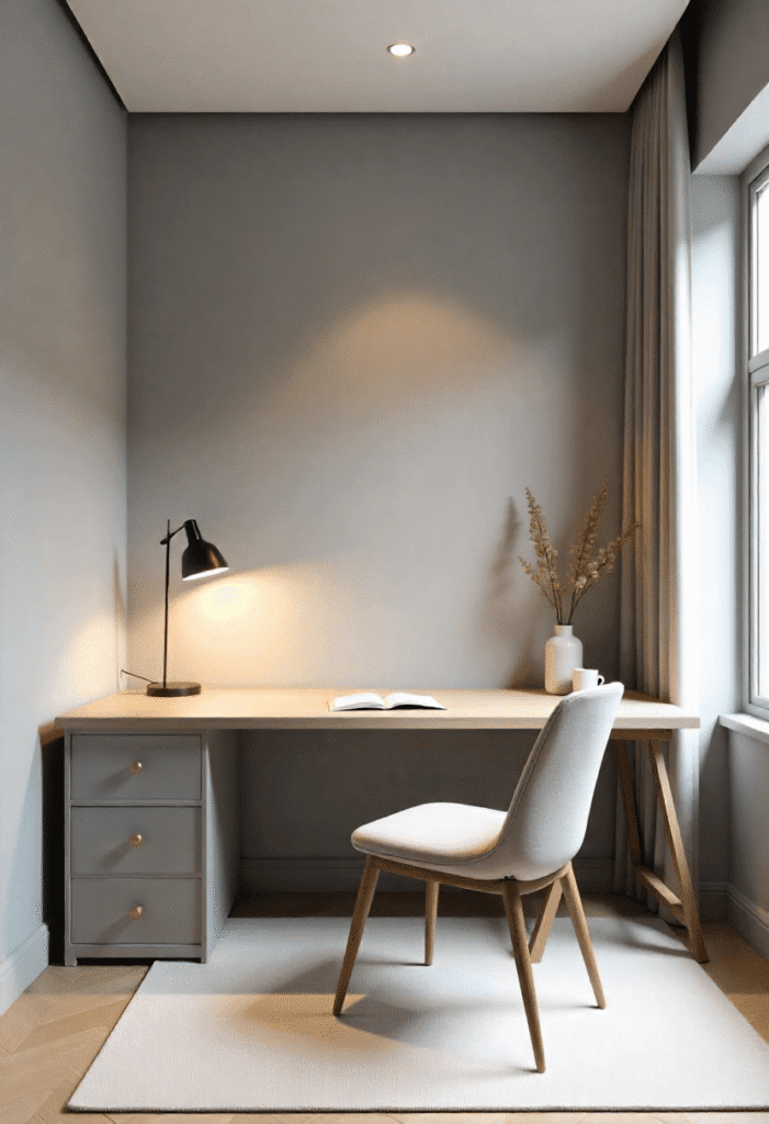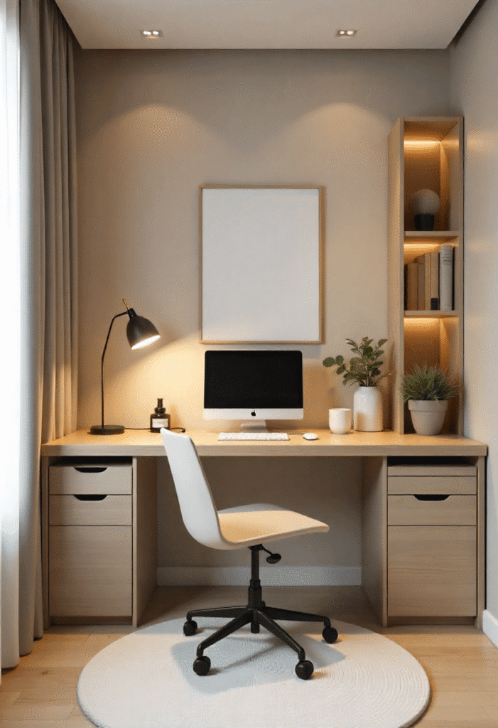 A home office is a place where you need both focus and comfort. Stick to a neutral palette of soft beiges, greys, and whites to create a calm environment. A simple, modern desk with thin metal legs and a streamlined chair will keep the space clean and functional. Hidden storage like drawers or a wall-mounted shelf ensures that everything has its place. Keep the décor minimal with a single statement piece of art or a small plant to keep the space fresh and inviting.
