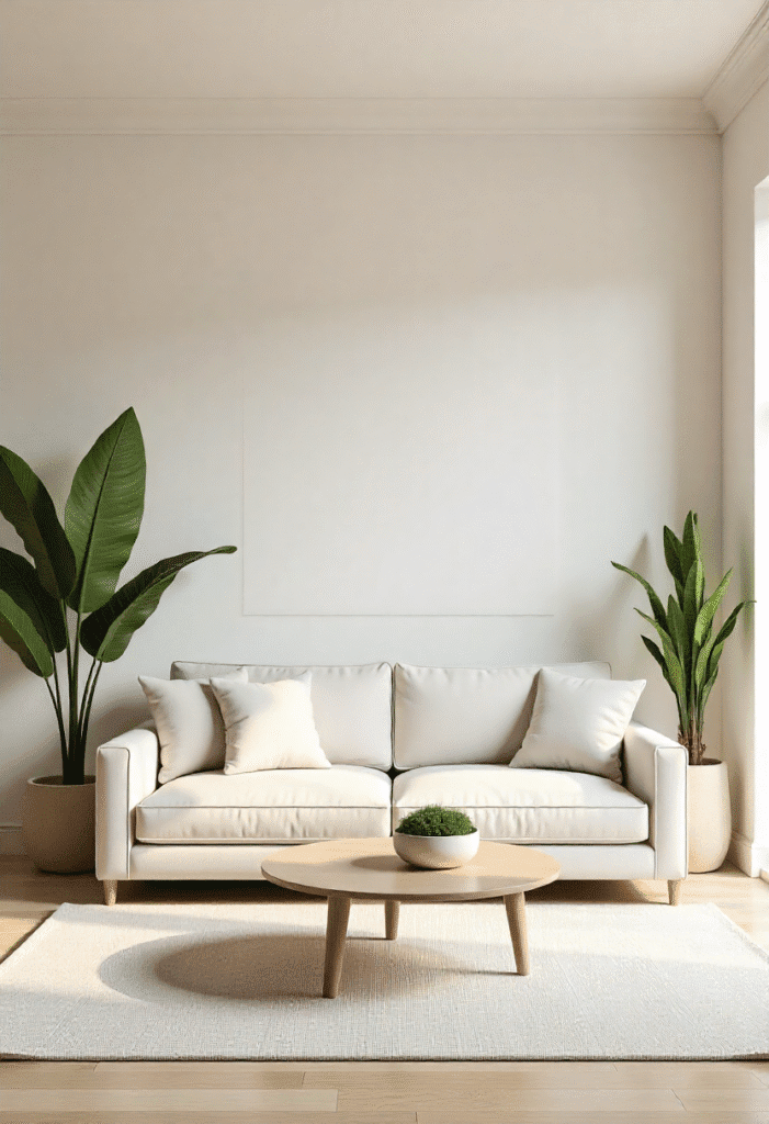 Add interest to a minimalist living room with a subtle geometric accent wall. This can be a simple design in neutral tones like grey or off-white that adds texture and depth without being too bold. Keep the furniture clean and simple—think a square sofa with straight lines, and a round coffee table. A few plants or a statement light fixture can serve as the focal point in the room, creating a balanced yet dynamic space.