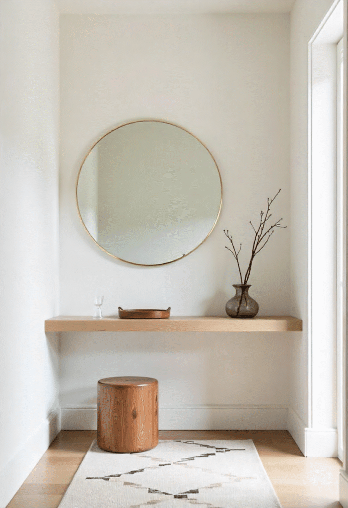 In a small entryway, less is more. Choose a floating console table that holds only the essentials—like a tray for keys and a small bowl for change. A single large mirror with a thin frame makes the space feel bigger and brighter. Coat hooks should be sparse but functional, while a soft, neutral-toned rug or geometric runner adds warmth and texture without overpowering the space.