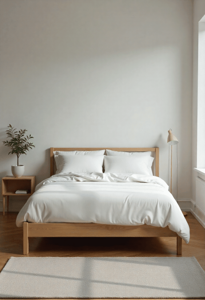 A minimalist bedroom can be both serene and inviting with a warm wood and white color scheme. Choose light wood furniture for a soft, natural look. A wooden bed frame with a geometric design paired with crisp white linens creates a clean, airy atmosphere. Keep the décor simple with a light grey rug and minimal wall art. A low wooden nightstand with a single plant adds warmth without cluttering the space.