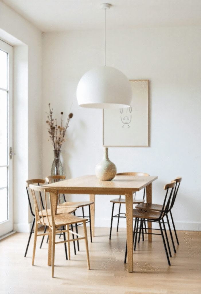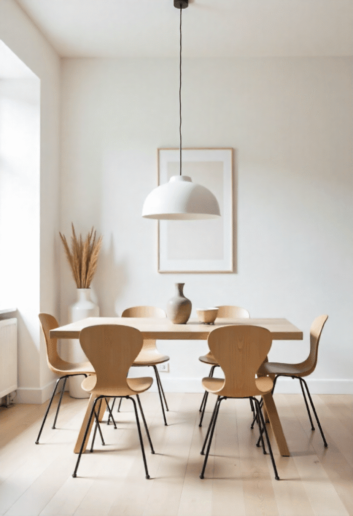 A minimalist dining area is all about simplicity. Opt for a simple wooden table paired with lightweight, metal or wooden chairs. Keep the room bright with natural light, and if needed, add a statement pendant light above the table. The walls should remain clear except for one piece of art or a decorative vase. This type of dining space is perfect for small homes or apartments where every inch counts.