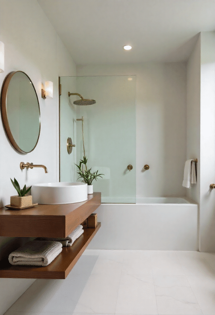 In a minimalist bathroom, natural materials like stone, marble, and wood create a sense of calm. Install a sleek, floating vanity with under-sink storage to keep the space tidy. A glass shower with minimal hardware makes the room feel open, while subtle organic touches—such as a small plant, bamboo towels, or a stone soap dish—bring texture and warmth to the space.