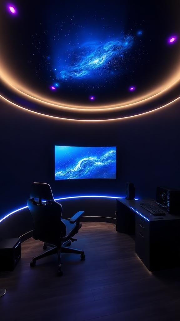 This idea merges two systems without visual or spatial confusion. One side holds a desk with a strong tower and widescreen monitor. The opposite end is fitted with a mounted display and a low lounge chair. Each section uses different lighting tones to match the play style. The distance between both zones supports quick transition. It allows multi-platform gaming in one space.