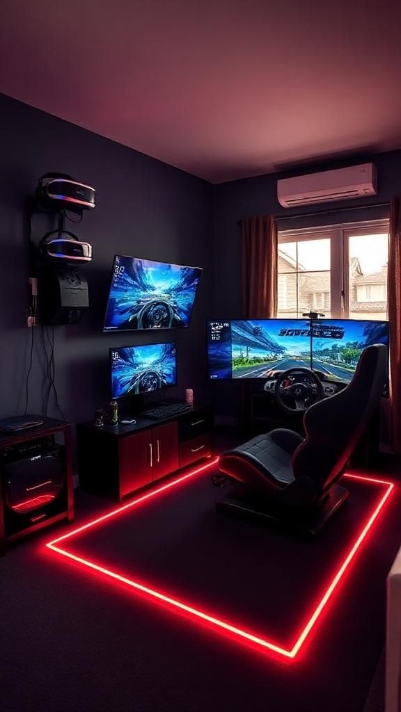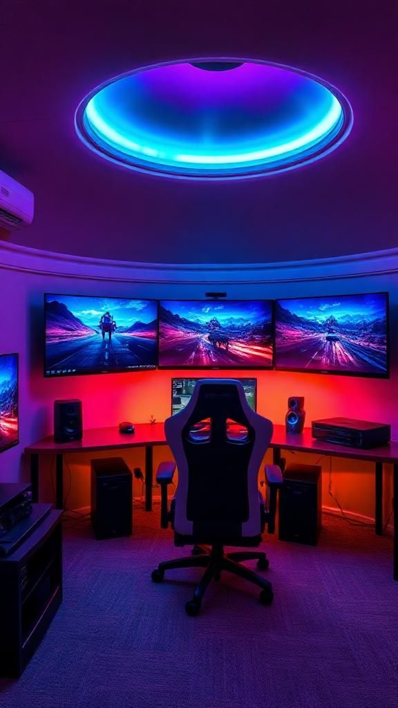 This room surrounds the player with screens and controlled lighting. Three or more curved monitors wrap from left to right. Ceiling lights pulse slowly to match gameplay rhythm. A blackout curtain closes off the space completely during use. Lighting from behind follows screen motion for added depth. The entire layout pushes visual involvement to the limit.