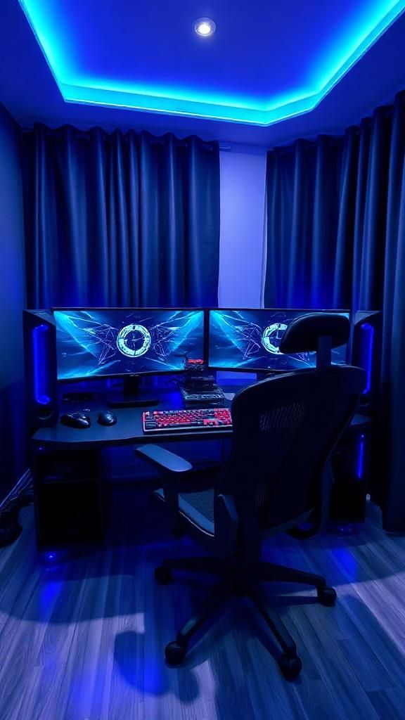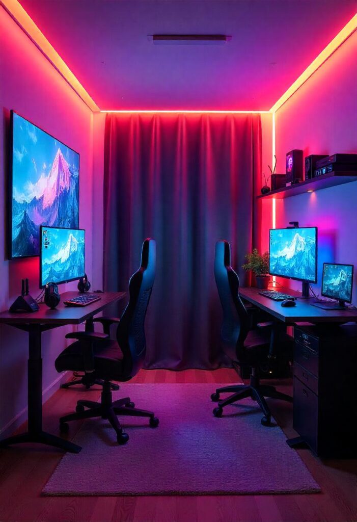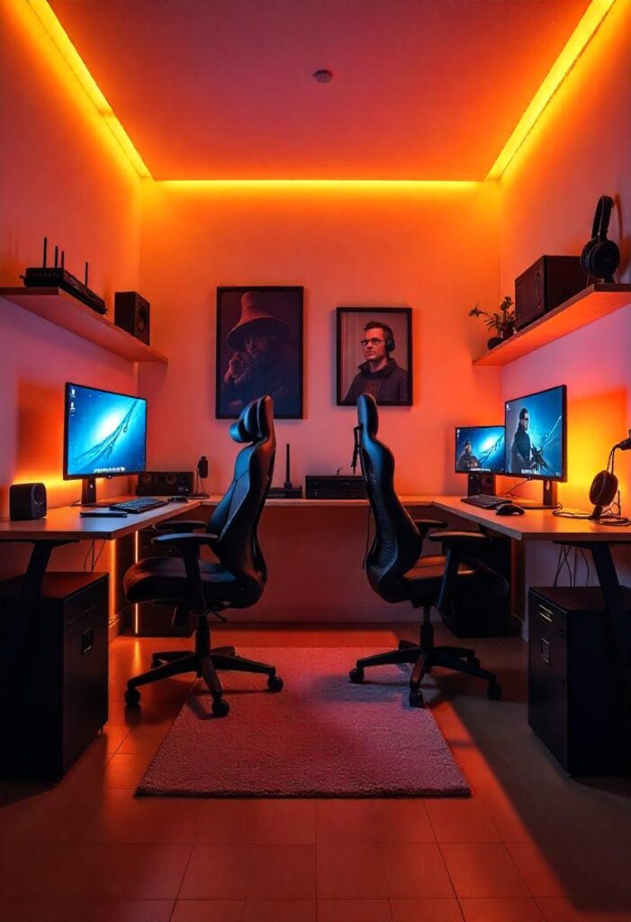 Two players can use this room without overlapping their zones. Each desk has its own lighting and audio insulation to reduce crossover sound. Chairs are positioned to avoid back-to-back collision. Shared lighting strips run across both setups for consistency. The layout works for co-op gaming or side-by-side solo sessions. Storage stays shared but symmetrical.