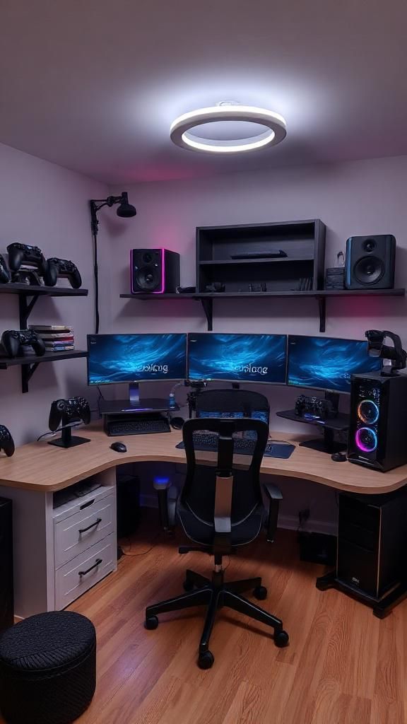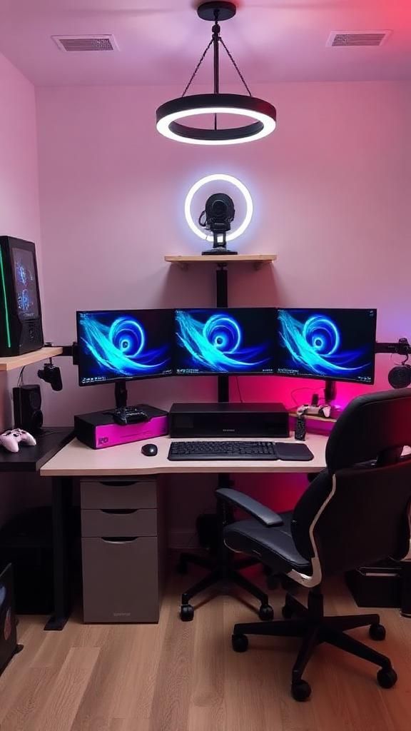This room supports both gameplay and live content creation. It uses three monitors to handle games, tools, and chat simultaneously. A microphone is mounted above to free up desk space. Lighting is soft and positioned to enhance camera presence. The background is arranged to stay clean in frame. Everything stays in place to support consistent recording quality.