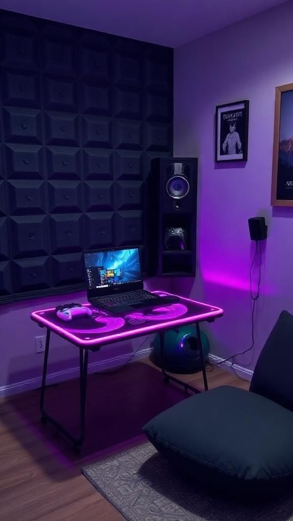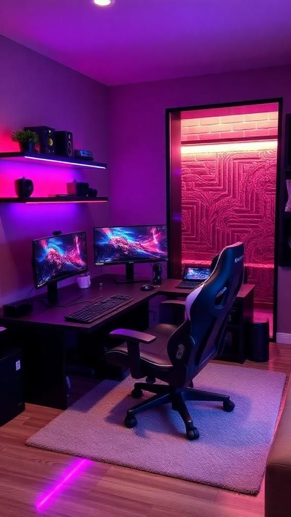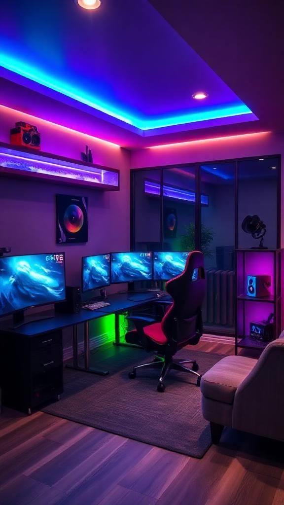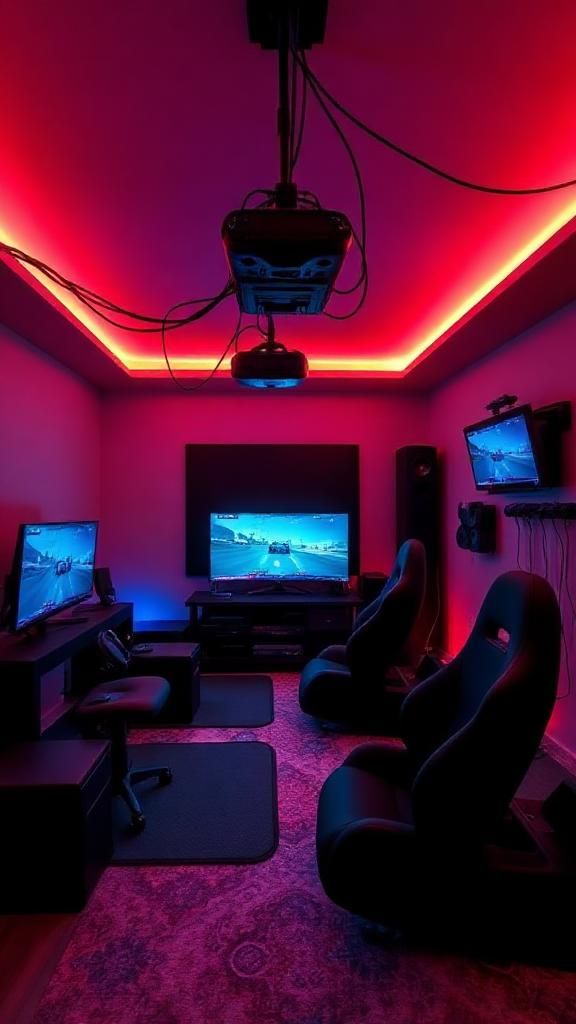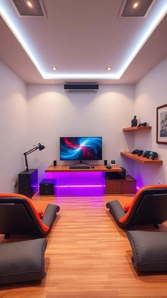 This room trades chairs for floor seating with low screen placement. Monitors are mounted near the ground to match relaxed viewing angles. Drawers under the screen store physical games and controllers. Floor lights stay dim to reduce reflection. Large padded seats or gaming cushions create a soft play zone. This layout favors console and handheld use over PC.