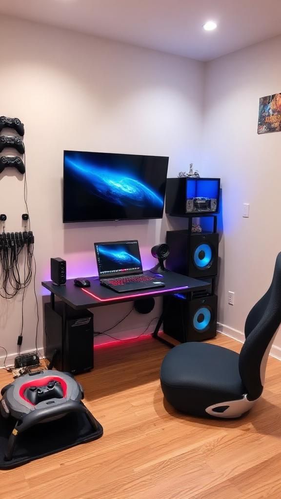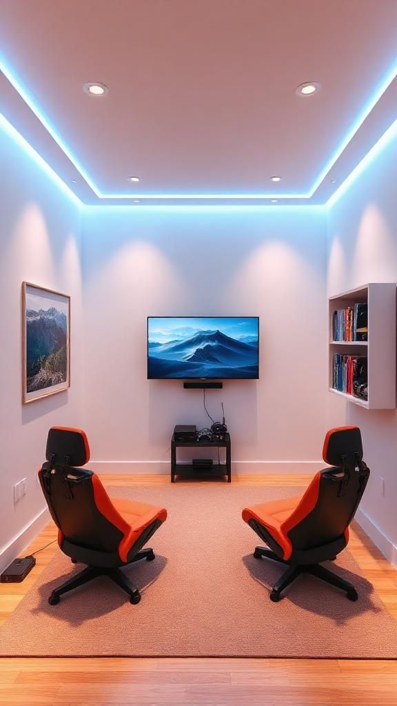 Built for laptop users and handheld consoles, this space avoids bulk. A small adjustable desk works with different seating heights. Wall-mounted arms hold extra screens or tablets if needed. Foldable chairs can be stored quickly after sessions. Cable hubs are fixed high to reduce wire mess. It supports a full experience within a very compact zone.