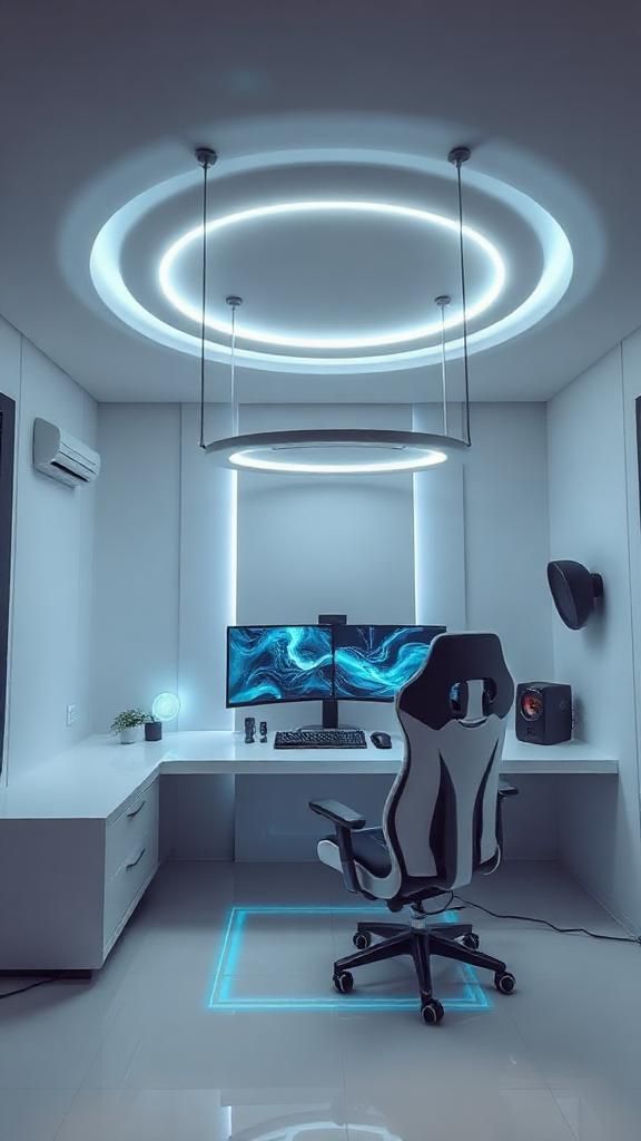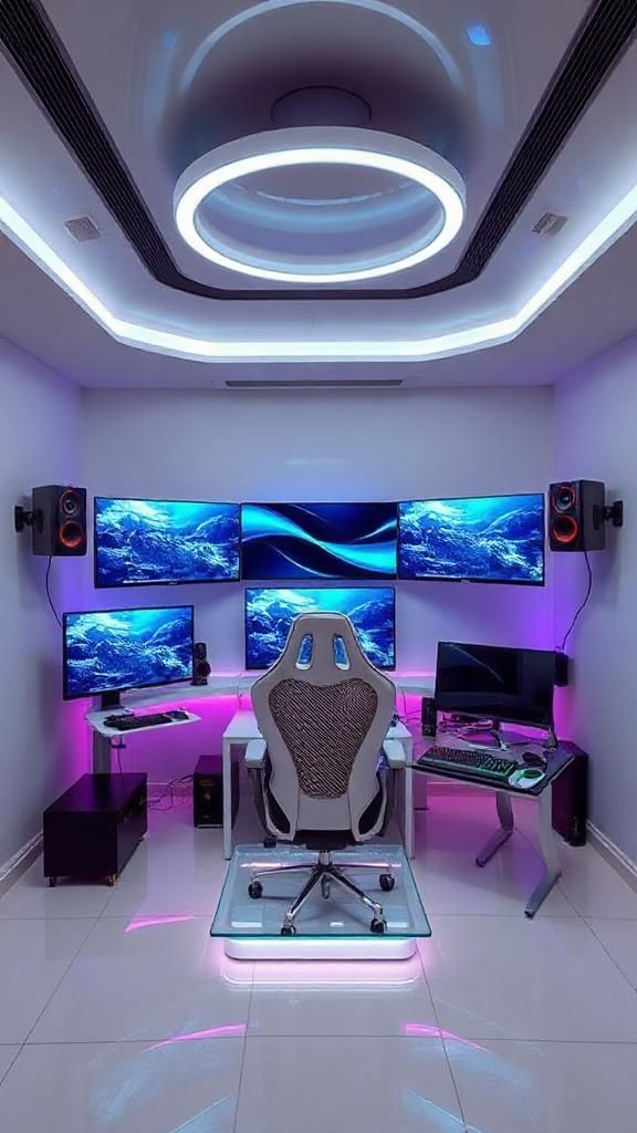 The design hides almost every supporting item from view. Monitors hang from ceiling arms, and desks float without visible support. The chair sits on a low-friction transparent base. All cables run behind the wall, and the PC is mounted inside the structure. Lights are fixed high and pushed into corners. This layout favors gamers who want visual stillness.