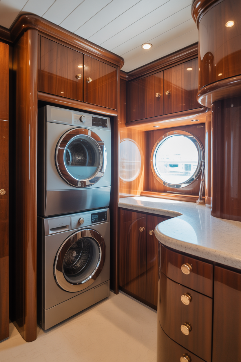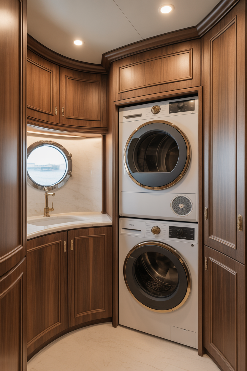 This concept borrows cues from luxury vessels. Curved walnut cabinetry and glossy lacquer finishes enclose compact stacked machines. Brass fixtures and hardware provide a marine-inspired polish, while a round porthole-style window adds character. The entire room feels as if it belongs on a yacht, tailored and precise with an indulgent edge.