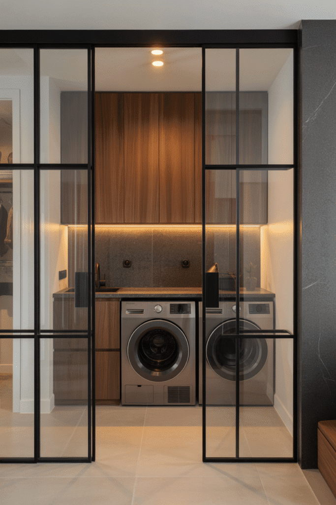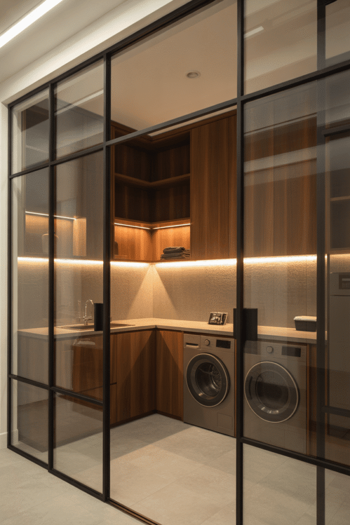 A glass-framed laundry room feels like a jewel box within the home. Black steel borders frame clear panels, while the inside reveals walnut cabinetry, polished stone counters, and neatly integrated machines. LED strips illuminate shelves so detergents and accessories look like part of a curated display. The glass enclosure turns the daily chore of laundry into something artful.