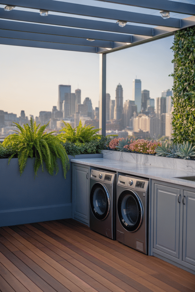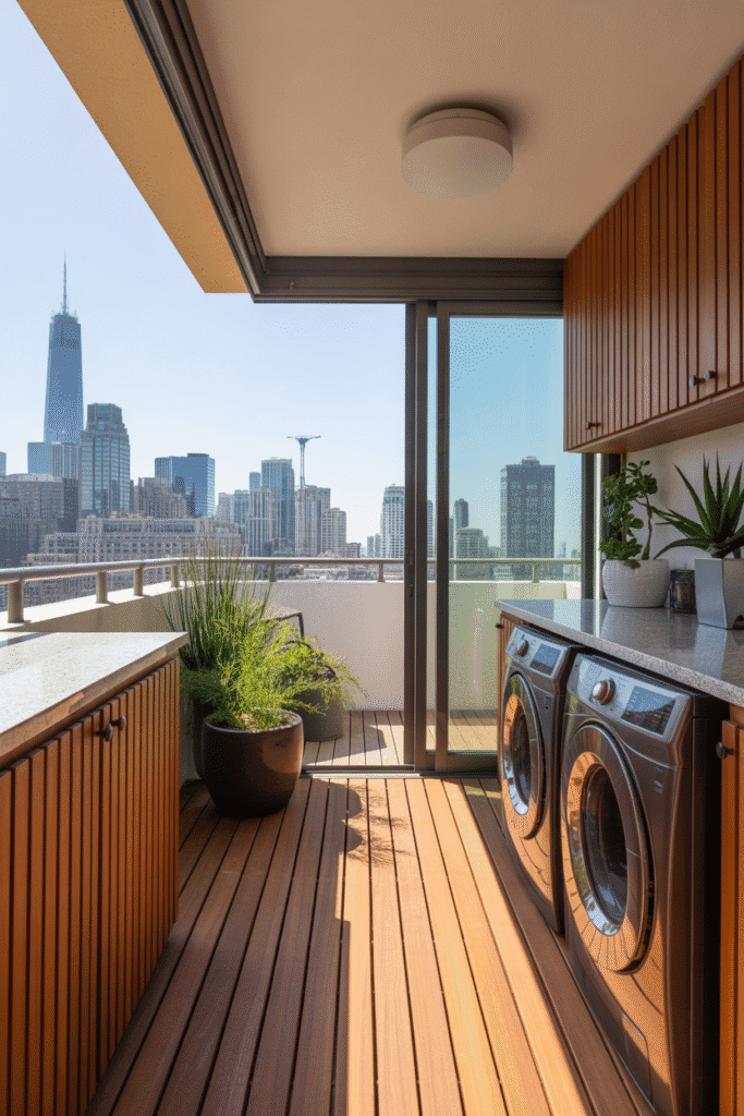 For apartments with limited square footage, a balcony laundry can feel both functional and indulgent. Custom outdoor-grade cabinetry houses the appliances, topped with a stone work surface. Teak decking underfoot adds warmth, while planters with greenery soften the edges. Sliding glass ensures protection from weather while preserving the sense of an open-air retreat.