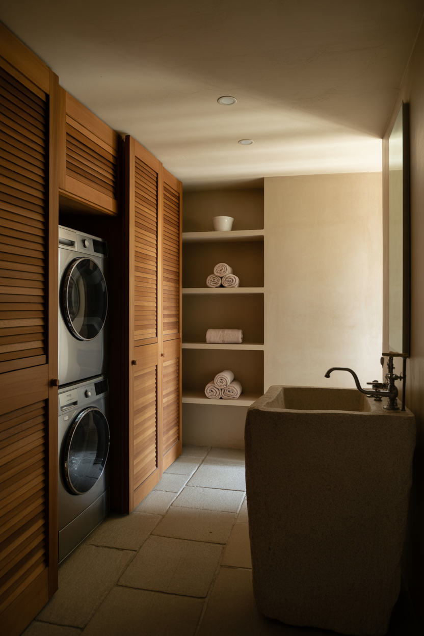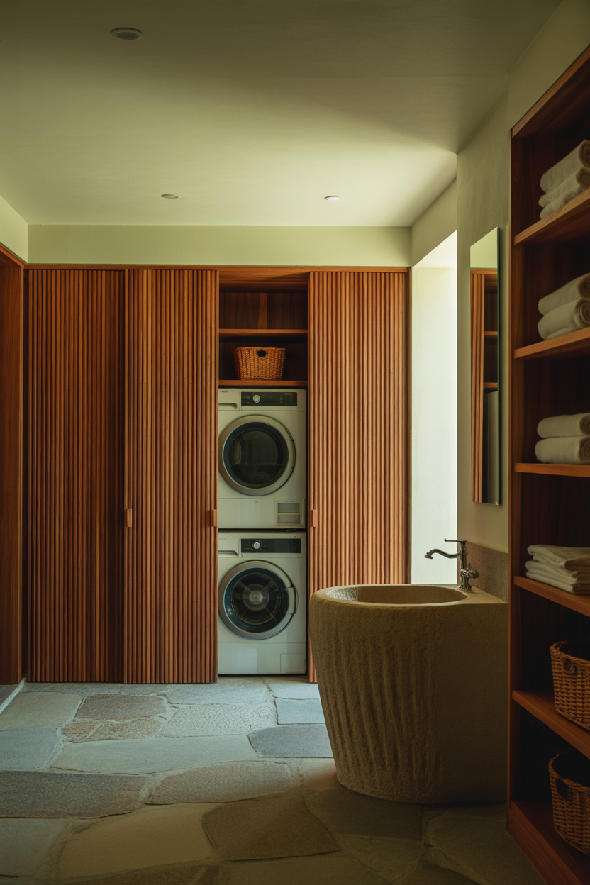 Inspired by wellness retreats, this design conceals appliances behind teak slats, blending them into natural surroundings. A deep stone sink sits beside open shelving with neatly rolled towels. Stone flooring and diffused lighting create a calm mood. The space feels as if it belongs in a spa resort, yet it serves as the home’s laundry hub.