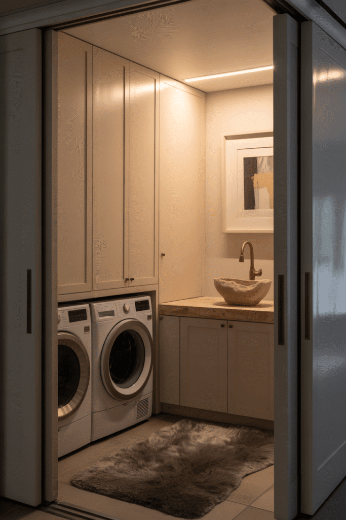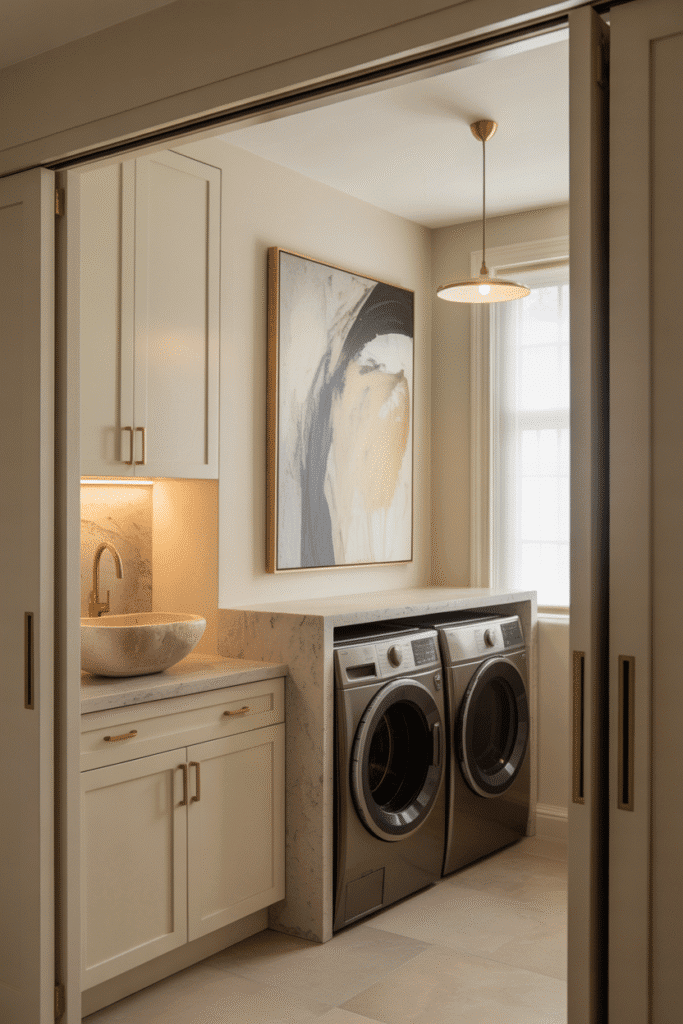 This approach hides an entire laundry within sliding pocket doors that glide open at the touch of a button. Inside, ivory cabinetry and stone counters create a calm, elegant environment. A sculptural ceramic sink anchors the space, while art on the far wall gives the room character. Closed, it disappears into the hall, open, it feels like a private gallery.
