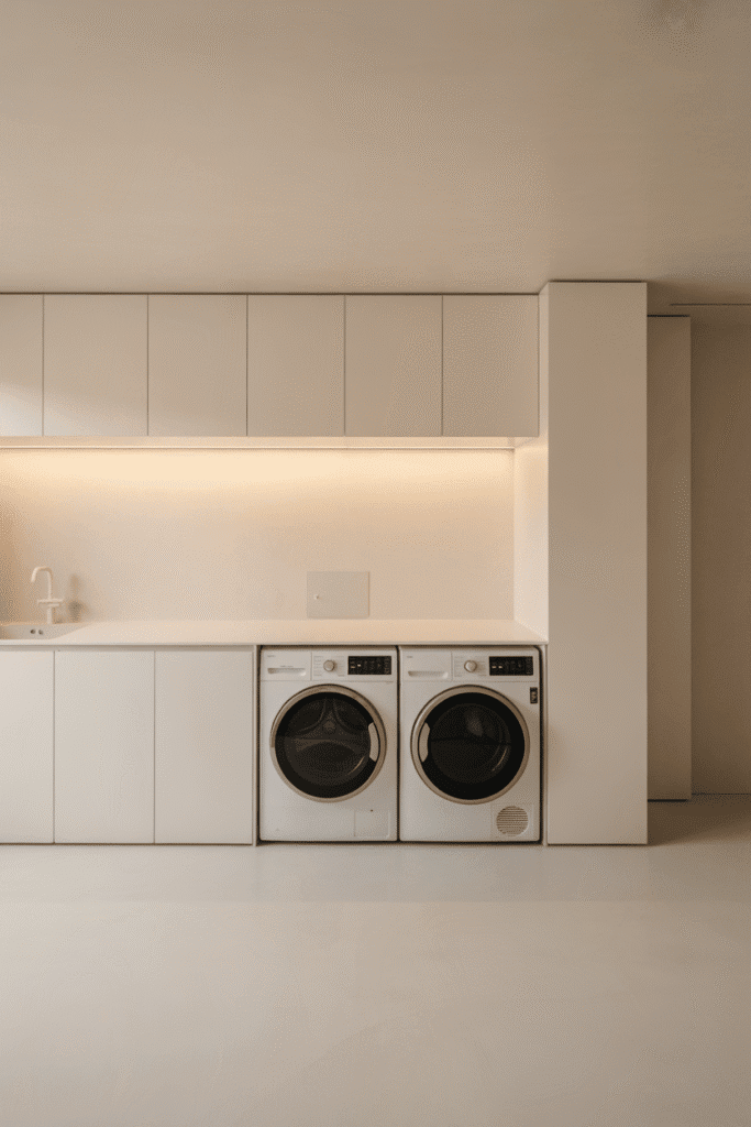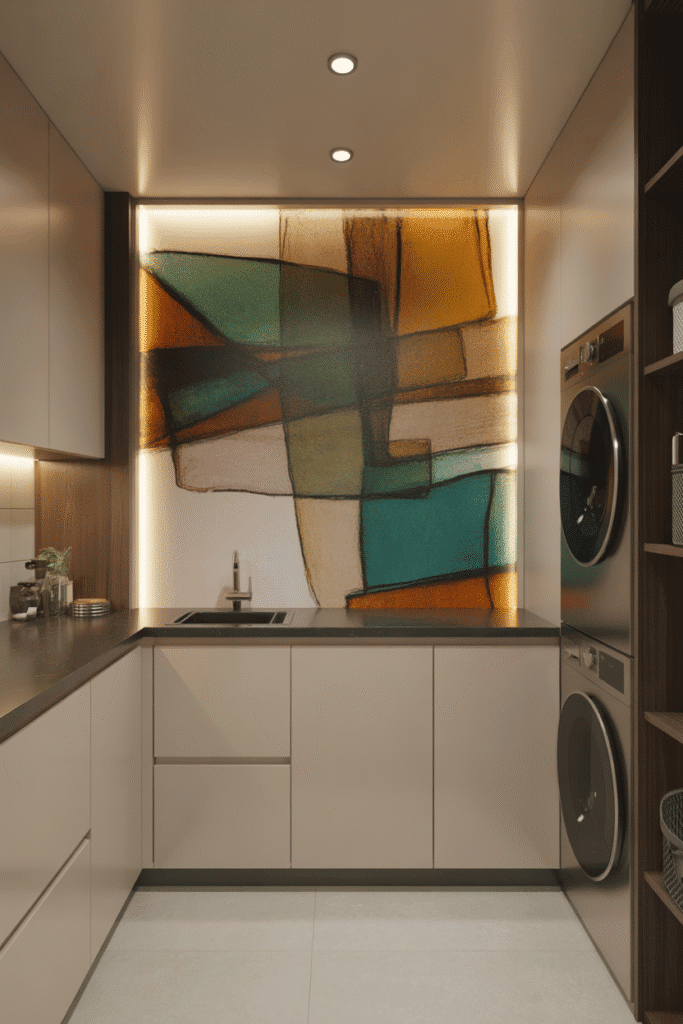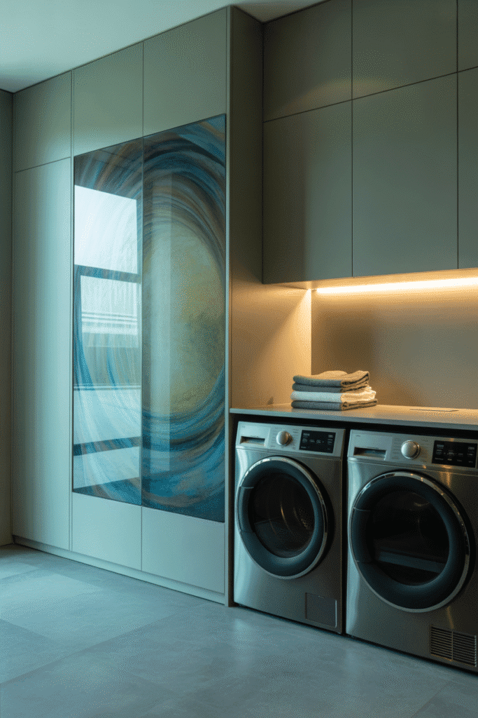 Here the laundry becomes a gallery. One wall features a backlit abstract glass panel or resin artwork that sets the tone of the entire room. Neutral cabinetry keeps appliances subdued, allowing the art to dominate. This approach turns a purely functional room into a space of inspiration and sophistication.