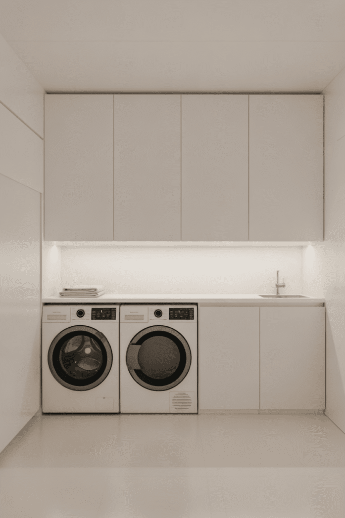 This design is all about purity and precision. Every surface, from cabinetry to counters to shelving, is finished in seamless white Corian. The washer and dryer sit side by side, topped by a perfectly aligned folding counter. Concealed task lighting brings clarity to the space, creating a futuristic cube that is as functional as it is striking.