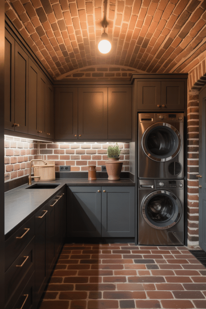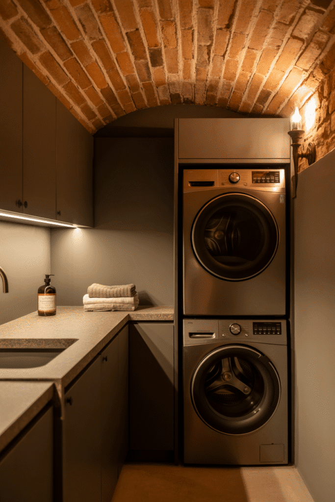 A disused cellar transforms into an atmospheric laundry retreat. Curved brick ceilings and soft lighting frame appliances set into matte black cabinetry. Soapstone counters provide durability with understated elegance. The mood is warm and intimate, making laundry feel like part of a private retreat rather than a daily obligation.