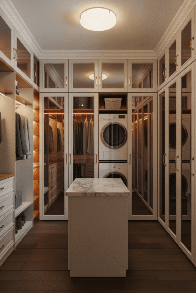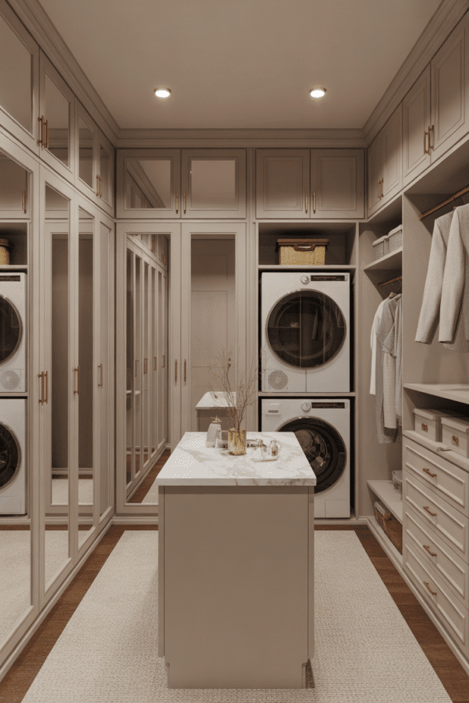 Imagine stepping into a space where clothing care and storage merge seamlessly. This design tucks appliances into mirrored wardrobe panels, keeping them hidden until needed. A marble-topped island offers folding space while doubling as a spot for accessories. Brass valet rods allow freshly pressed garments to be stored instantly. The room functions as both laundry and luxury closet.