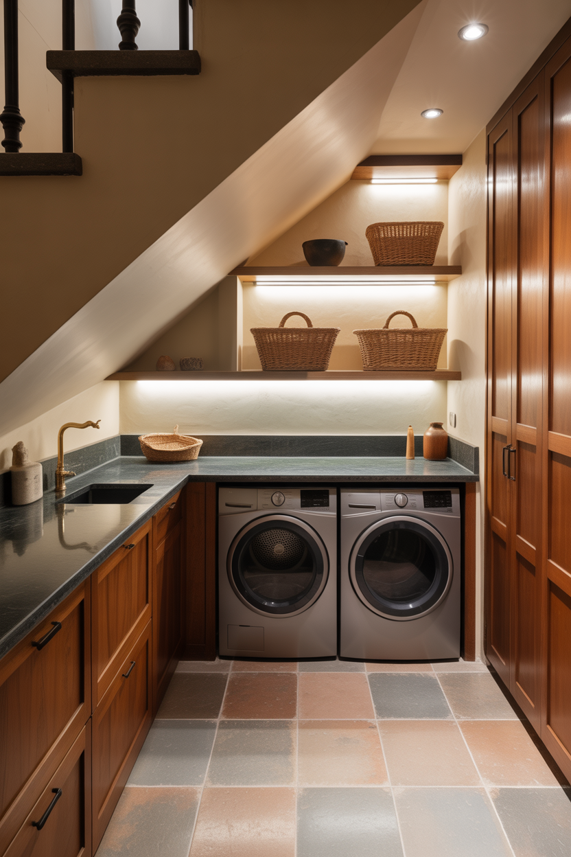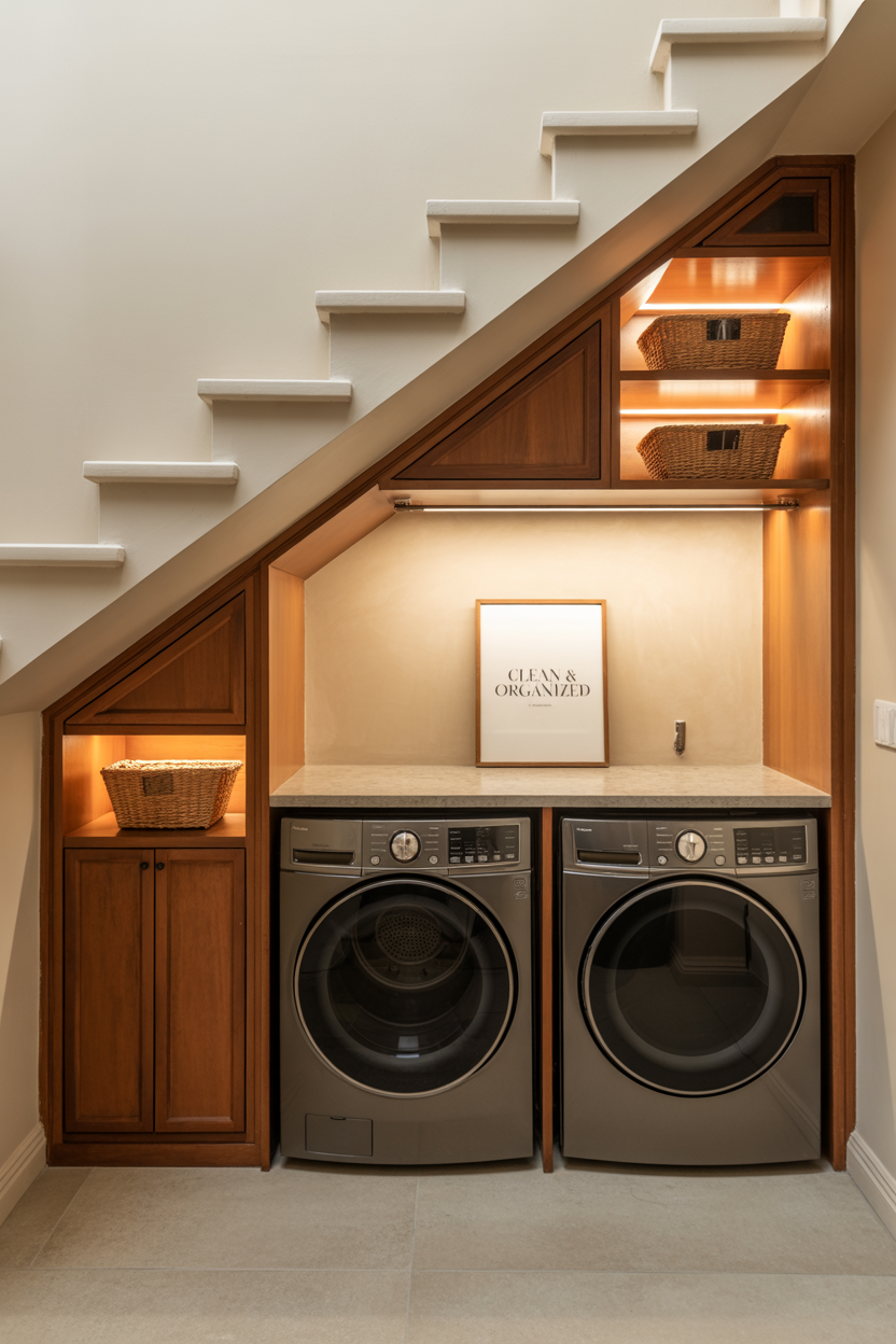 Unused space beneath a staircase is reimagined as a high-end laundry alcove. Custom cabinetry follows the slope of the stairs, making every inch purposeful. Polished plaster finishes and stone counters ensure durability while maintaining elegance. Backlit niches for baskets turn storage into design, balancing practicality with sophistication.