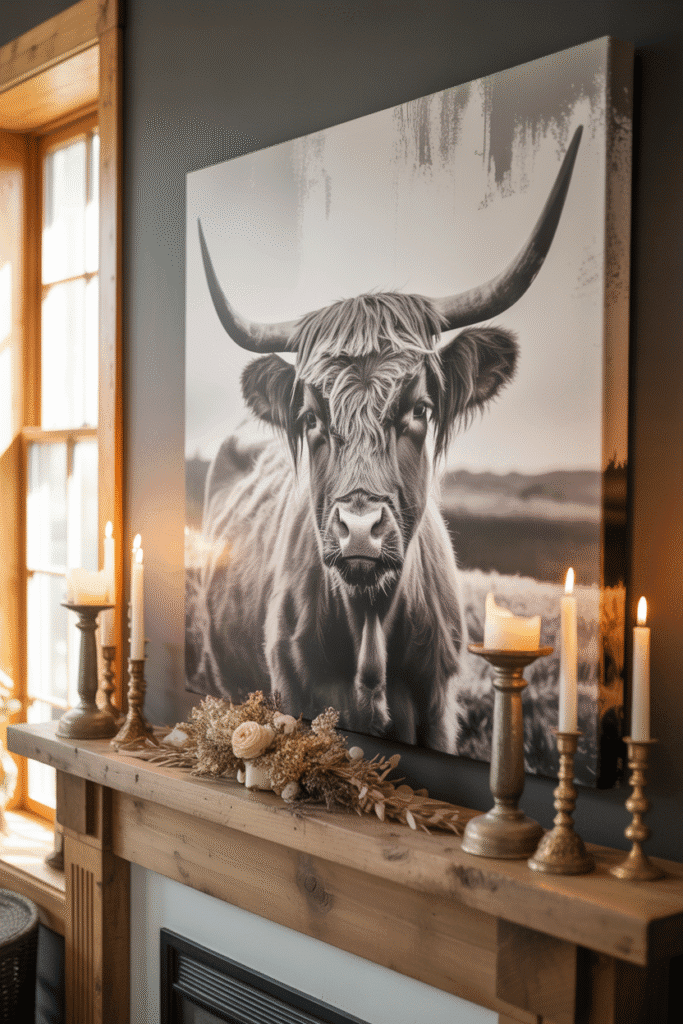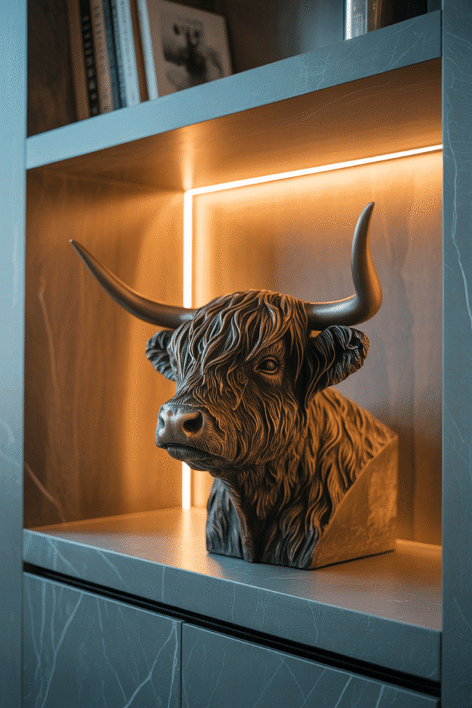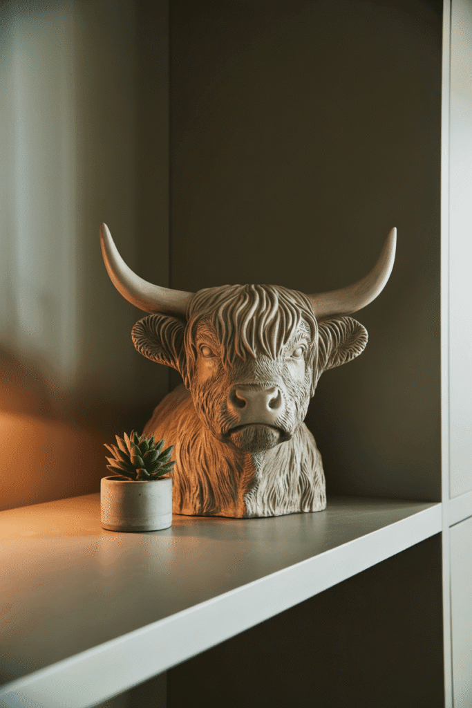 For a more artistic take, add a sculptural bust of a highland cow on a shelf or wall. Resin and faux stone finishes work great for giving it a more gallery like appearance. This is not kitschy decor. It is bold and modern when styled right. Keep the surroundings simple so the piece can stand out. It works well in office spaces, reading nooks, or as part of a nature inspired vignette.