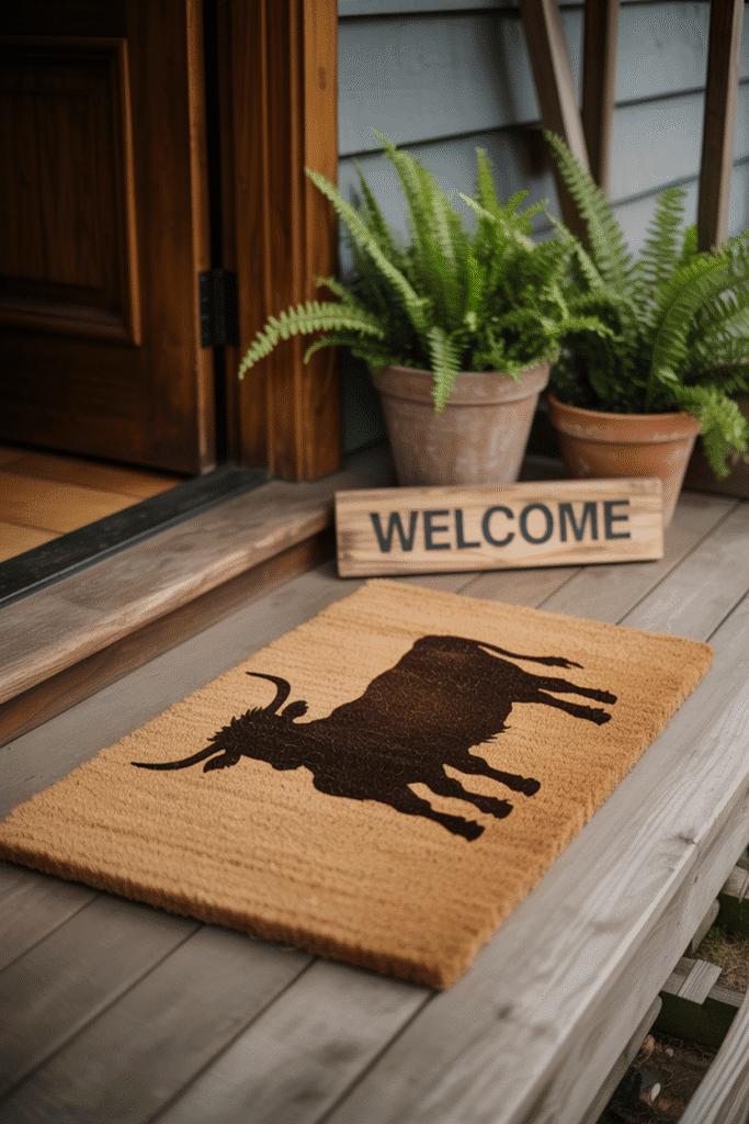 Welcome guests with a coir doormat featuring a clever or minimal highland cow design. Skip the loud, cartoonish versions and opt for something with a clean line drawing or simple silhouette. It adds a touch of personality without overwhelming your doorstep. Pair it with potted plants or a wooden welcome sign to complete the look.