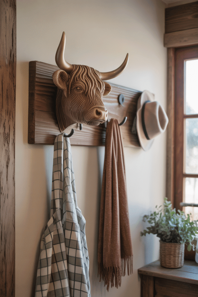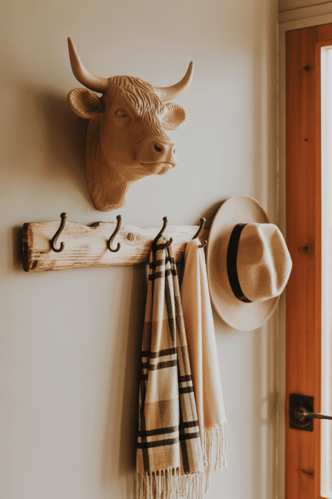 Replace boring hooks in your mudroom or entryway with metal or wood hooks shaped like highland cow heads. These can be practical while adding personality to a functional area. Look for styles with realistic detailing or a minimalist silhouette depending on your taste. It works beautifully in rustic, boho, or farmhouse interiors. Functional decor like this gives everyday items a unique edge.