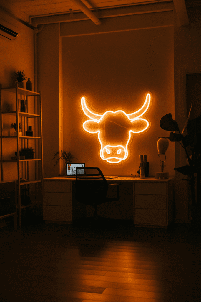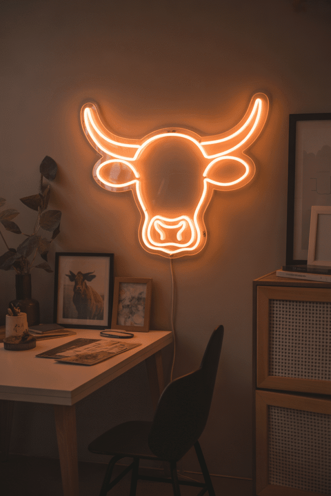 Add a modern twist with a neon sign shaped like a highland cow silhouette or featuring a playful phrase paired with the image. These signs work great in teen rooms, creative studios, or as a quirky element in a neutral space. Use warm white or amber lighting to keep the aesthetic cozy rather than commercial. It is an unexpected way to bring character into the room.