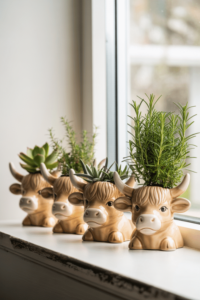 These are small but impactful. Look for hand sculpted ceramic planters shaped like highland cows or featuring their faces. Place them on windowsills, bookshelves, or kitchen counters with herbs or succulents inside. They are cute, but when made with quality materials and neutral glazes, they blend into even minimalist spaces. A few scattered throughout your home go a long way.