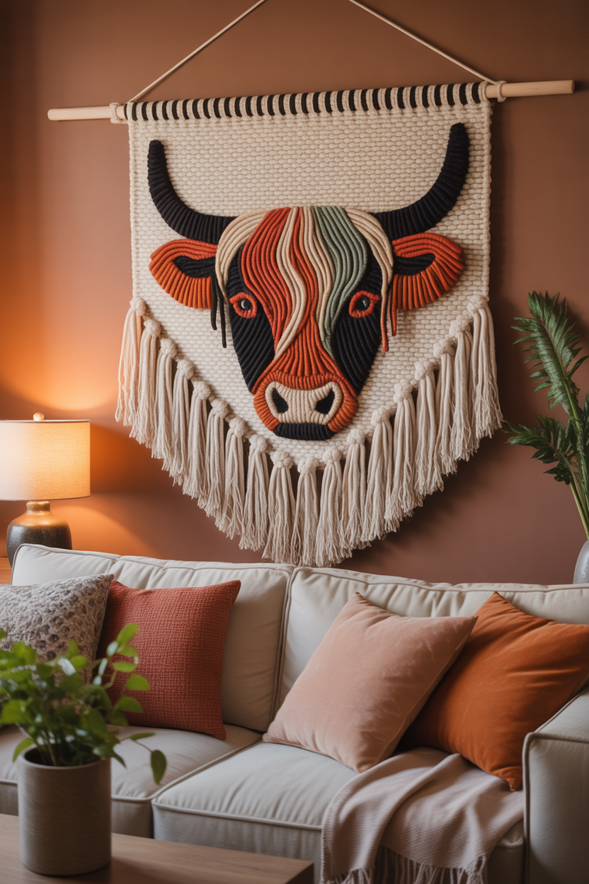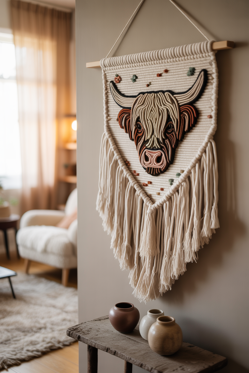 Combine texture and art with a woven or macrame wall hanging that includes a stylized highland cow. This works especially well in boho or Nordic interiors where natural fibers are key. Look for handmade pieces or support small makers through craft markets or online platforms. The layered fibers create movement and softness that a framed print cannot match.