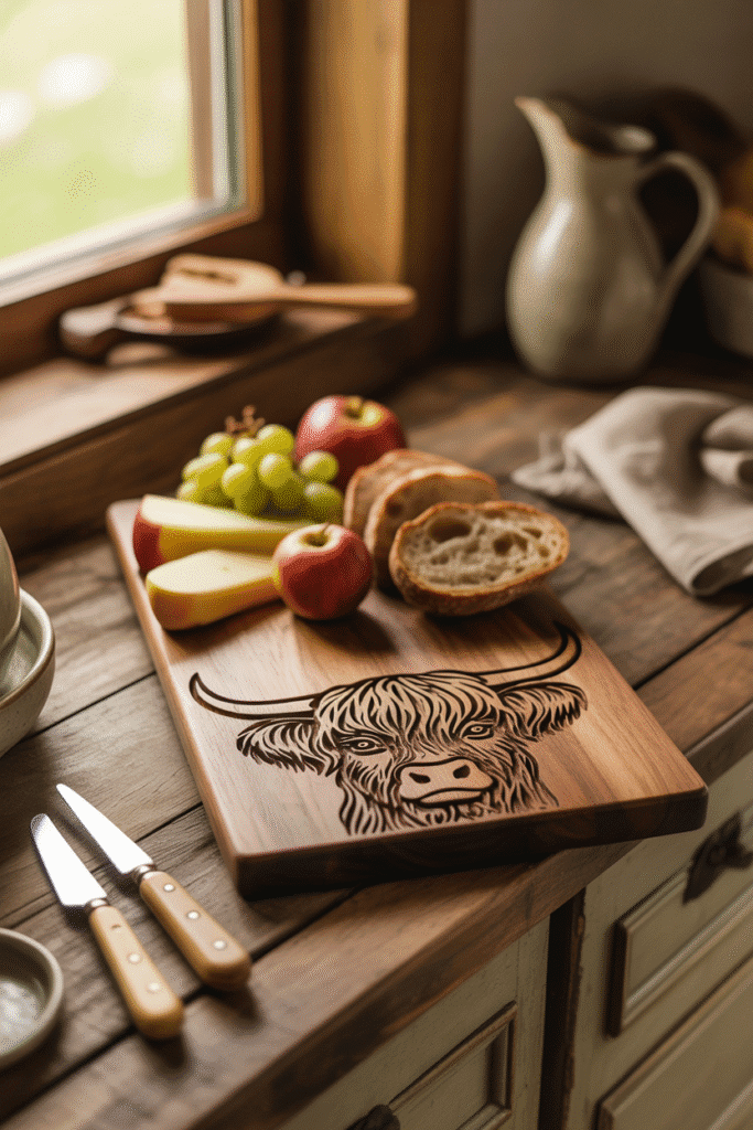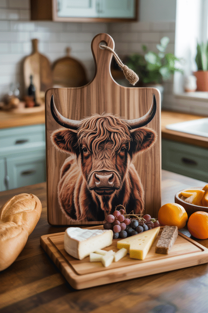 A wood serving or charcuterie board with a carved highland cow design is both decorative and practical. Hang it on the kitchen wall when not in use or use it as a cheese board during gatherings. It adds warmth and storytelling to your kitchen or dining area. Look for boards made from walnut or olive wood for a more premium feel. You can even commission local artisans for a custom design.