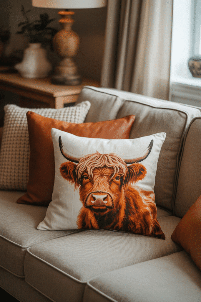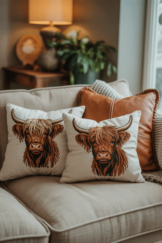 Textiles offer a soft and subtle way to bring the theme in. Instead of printed patterns, go for embroidered or tufted designs of highland cows. Choose earth toned or neutral backgrounds so the texture does the talking. These pillows work well in living rooms or bedrooms that need a bit of whimsy without being juvenile. They mix easily with leather, linen, or knit fabrics for a layered look.