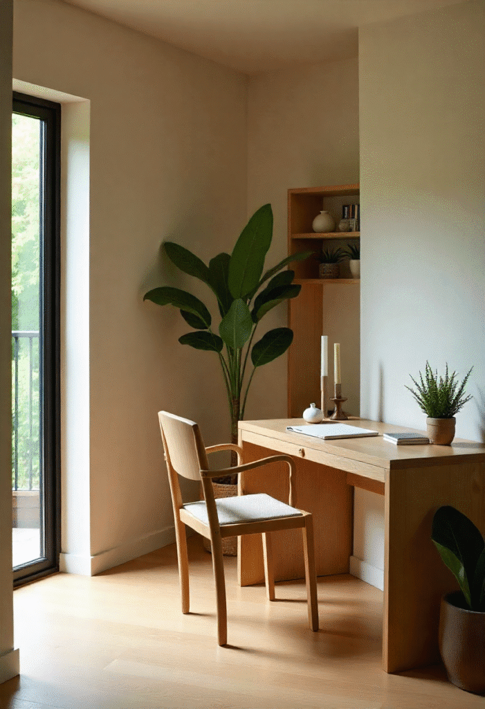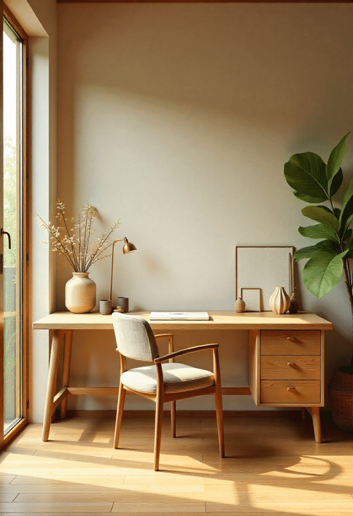 Create a peaceful home office with a Japanese-inspired design that promotes focus and serenity. Use natural materials like wood, bamboo, and stone for the furniture and flooring. A simple wooden desk paired with a comfortable chair and clean lines will make the space feel spacious and calm. Include a few plants or a small indoor water feature to add a touch of nature to your workspace.