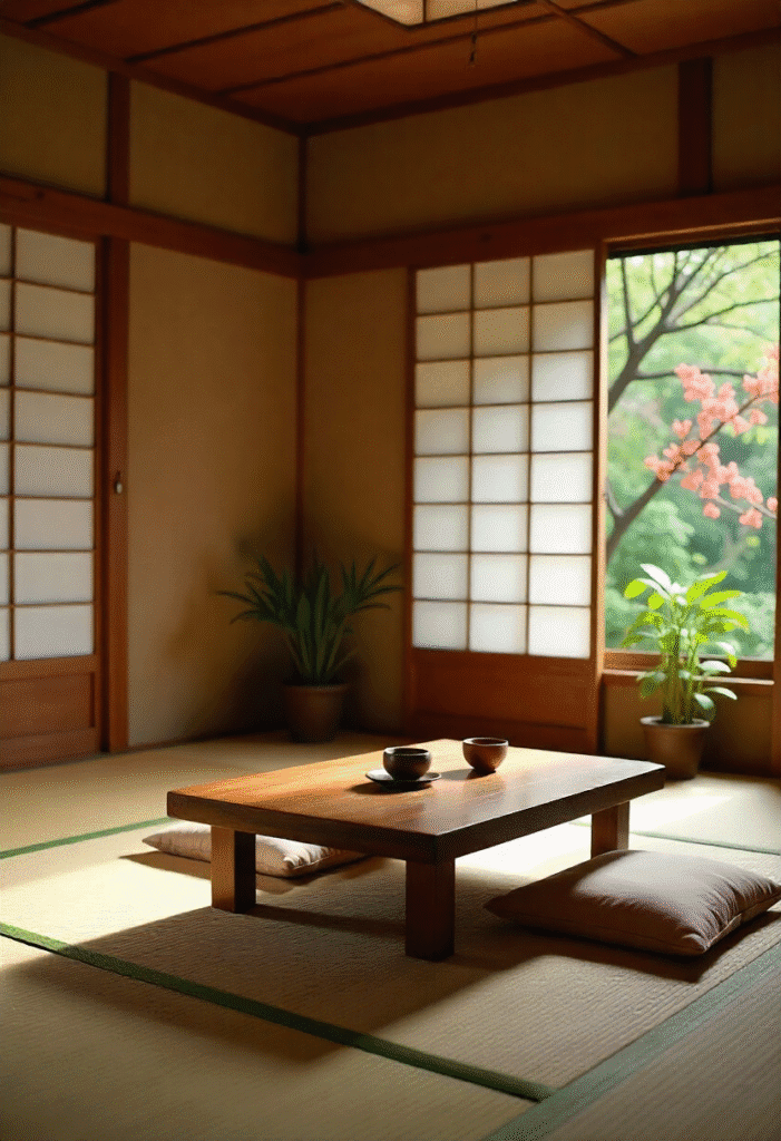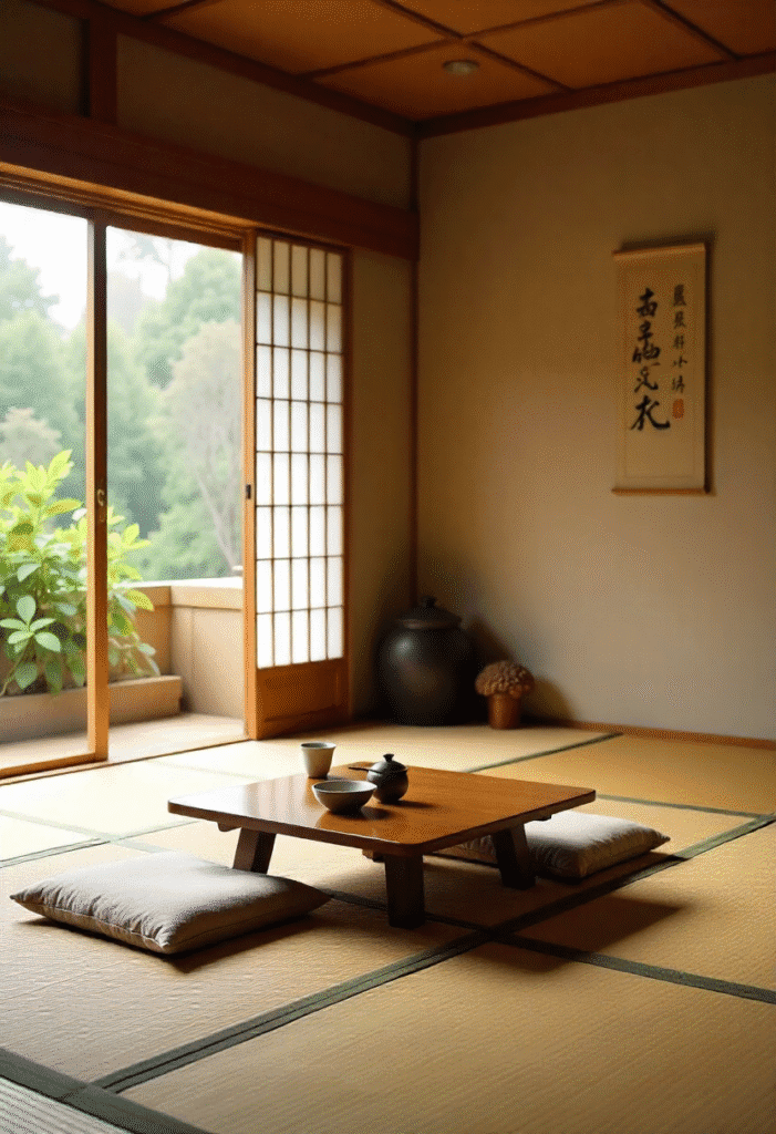 A Japanese tea room is designed for contemplation and ritual. These rooms are serene and unadorned, featuring elements such as tatami mats, sliding doors (fusuma), and low tables. The walls might display calligraphy or traditional artwork, and the atmosphere is quiet and refined. Tea ceremonies are an important cultural practice in Japan, and designing a room for this purpose brings a sense of peace to your home.