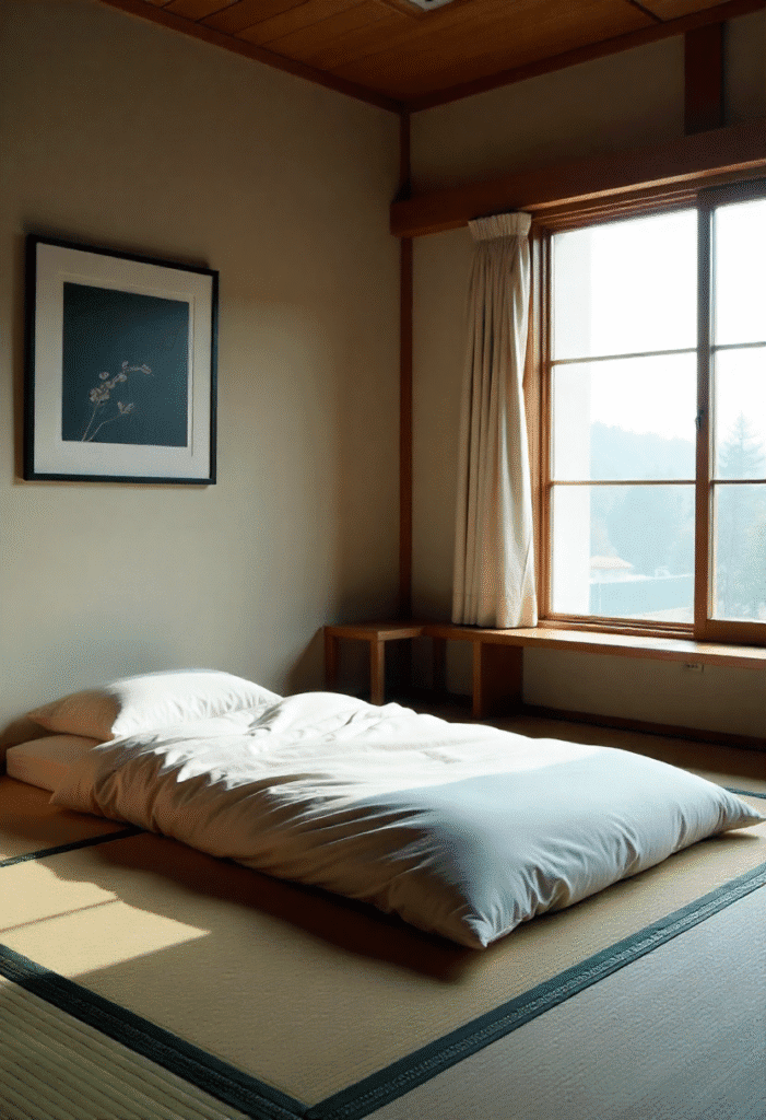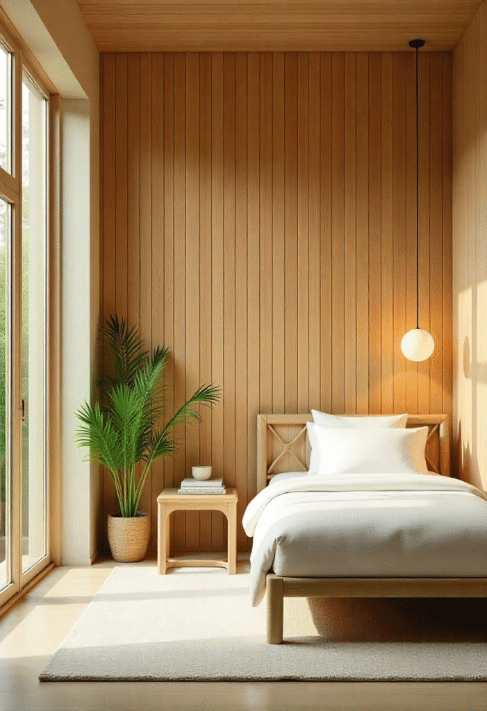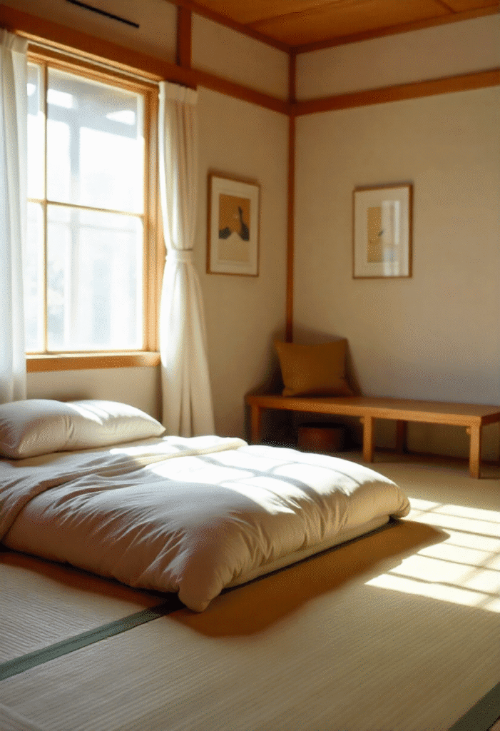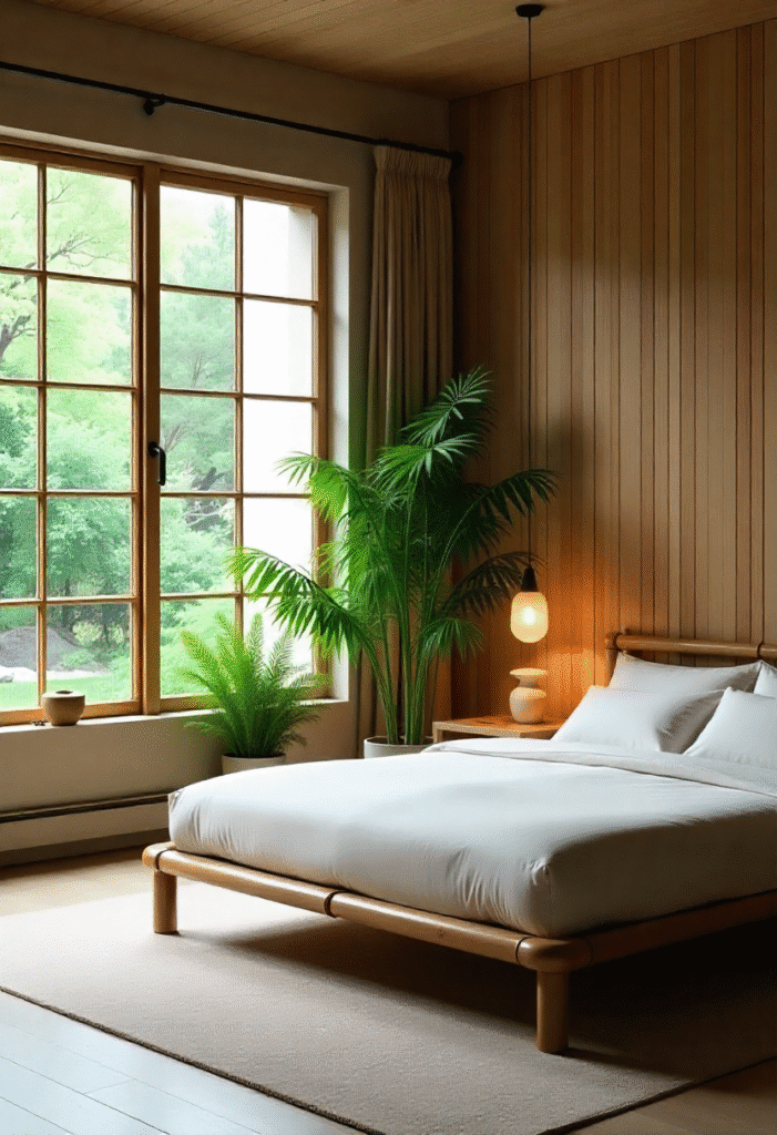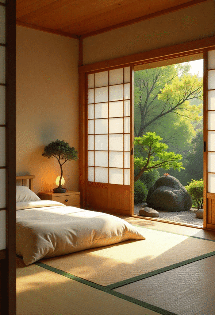 Bamboo is a staple material in Japanese homes, offering both beauty and functionality. In a bamboo-inspired room, walls could be accented with bamboo paneling, or bamboo furniture could be used for chairs and tables. The natural texture and color of bamboo add warmth and bring an organic touch to the design. Pair this with soft, neutral-colored bedding and cushions for a calming atmosphere.