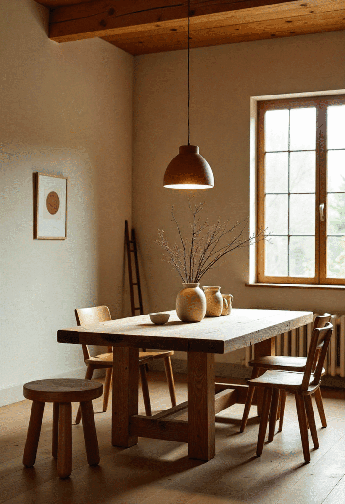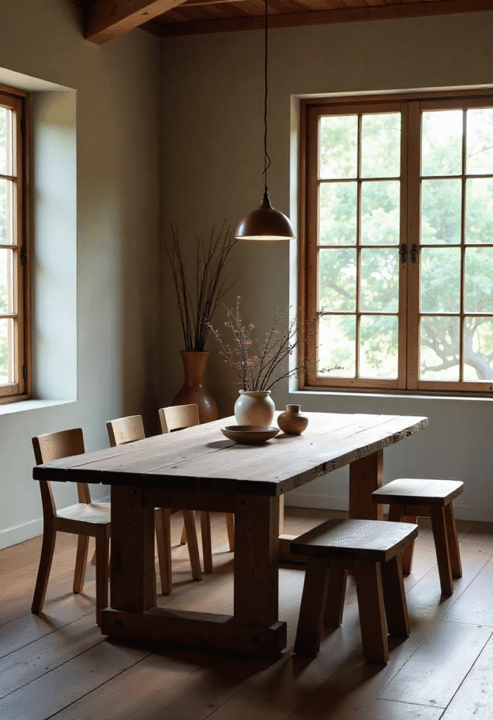 Wabi-Sabi is the art of finding beauty in imperfection, embracing the natural cycle of growth and decay. A wabi-sabi dining room celebrates simple, rustic furniture with natural imperfections such as a wooden table with visible grain and knots. The focus is on creating an intimate, inviting space that feels grounded and authentic. Decorate with hand-crafted pottery or mismatched tea cups to add warmth and character.