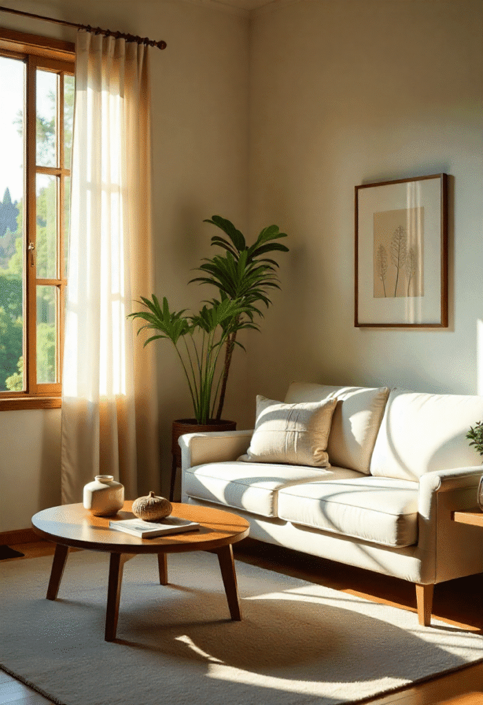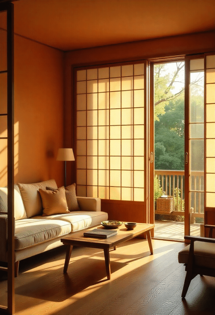 Shoji screens are iconic in Japanese interiors, traditionally used as room dividers or window coverings. A living room with Shoji screens adds a soft, diffused light to the space while also creating a functional division of rooms. The screens’ translucent paper diffuses sunlight and creates a serene atmosphere. Combine this with low, minimalist furniture like a futon or a low couch for a fully authentic look.