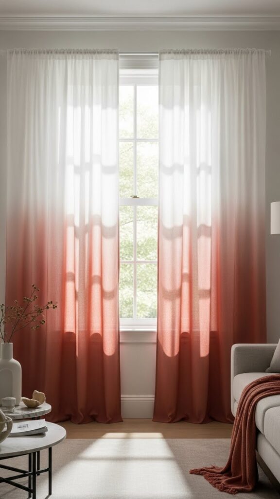 Curtains that shift gently from one shade to another—like white fading into dusty blue or beige melting into warm terracotta—add soft drama without overwhelming the room.
