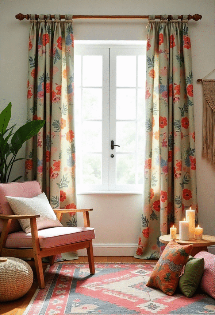Flowing floral curtains in corals, greens, and purples bring a relaxed, happy feel. Layer over white sheers for depth.