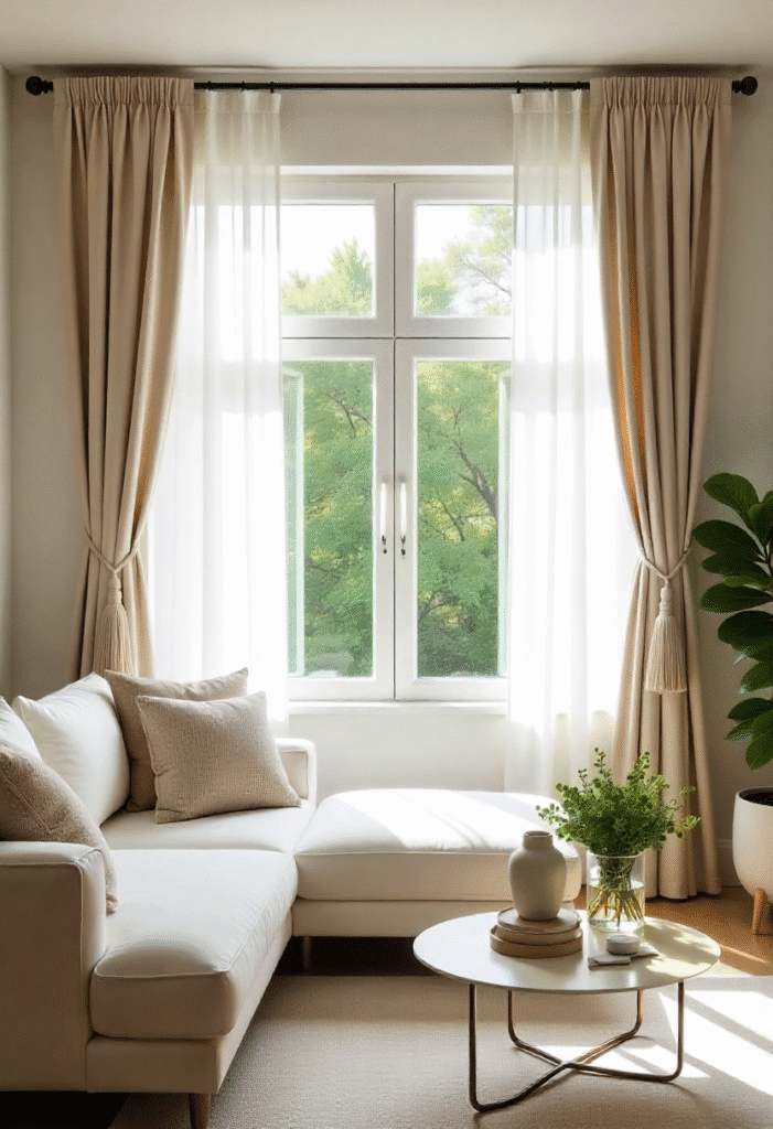 Light sheer white panels let in soft sunlight by day. Pair them with thicker neutral drapes (beige or soft gray) for privacy at night.