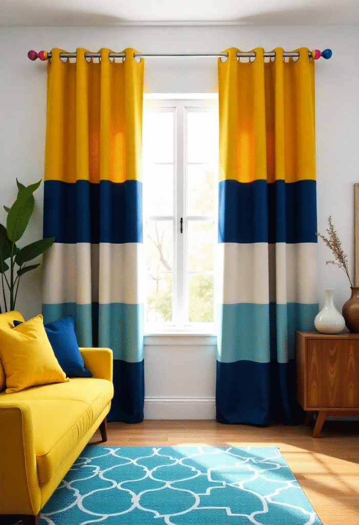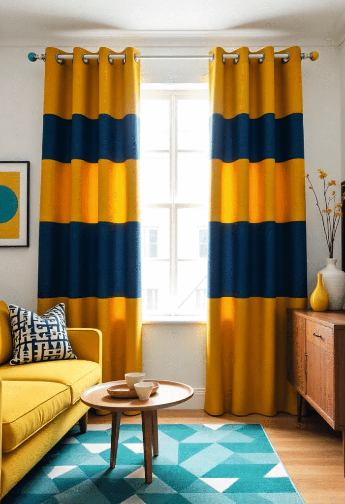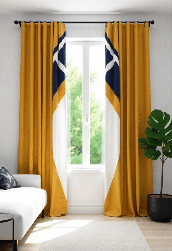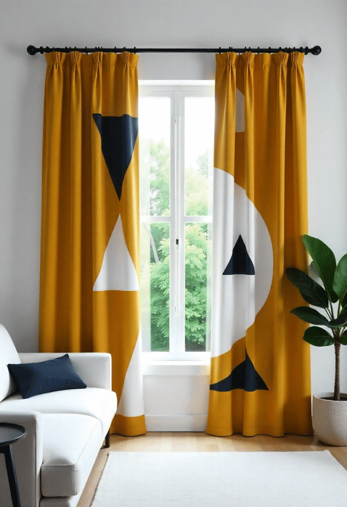 Go big with vibrant shapes like yellow triangles on navy blue over white fabric. These curtains steal the show.