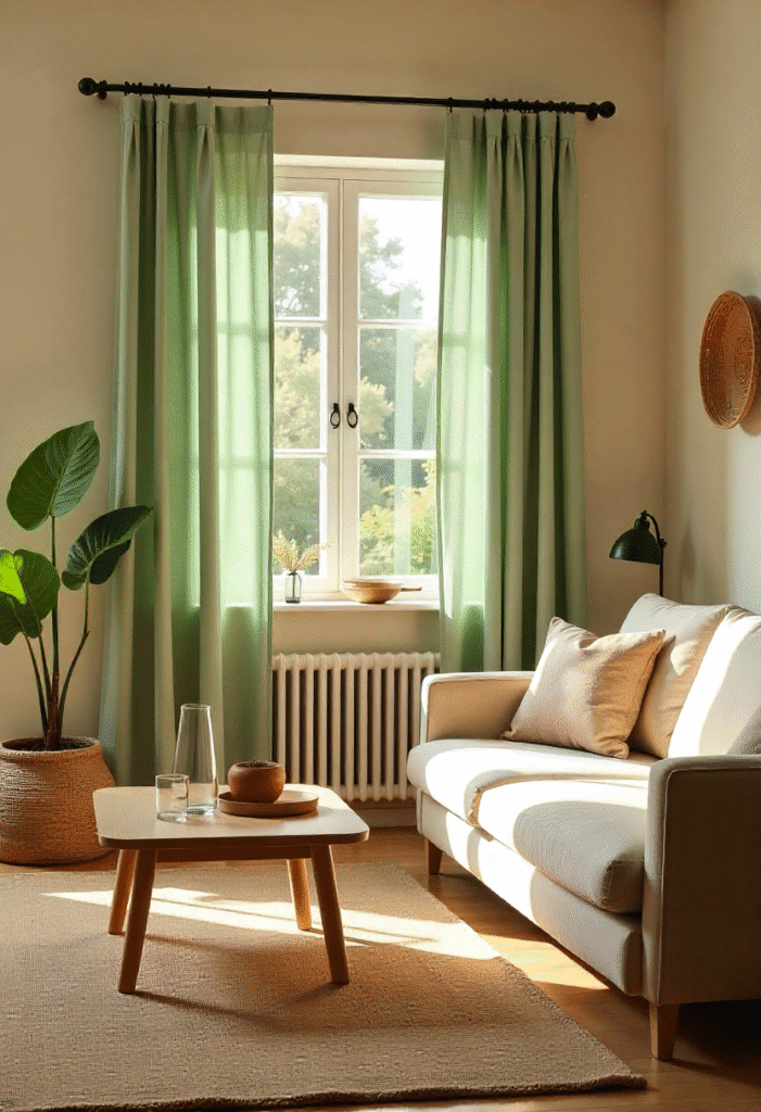 Sage green or sandy linen curtains with natural texture feel grounded and peaceful.