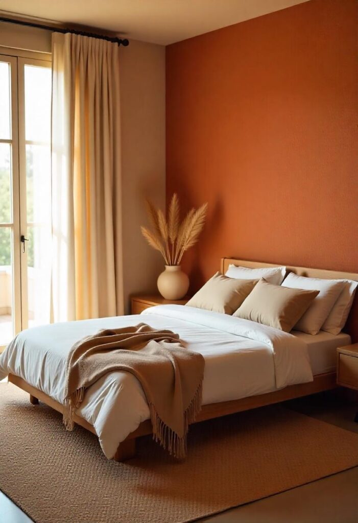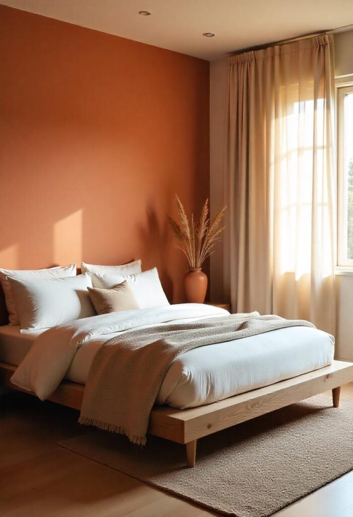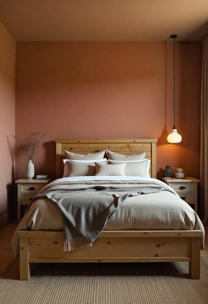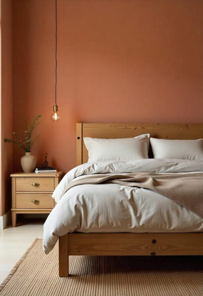 A terracotta clay wall introduces natural depth through surface texture and tone. The pigment works well with soft daylight and matte finishes. It enhances the warmth of the space without relying on excessive decor. Pairing it with light oak furniture adds balance and visual contrast. Minimal bedding in white or stone shades allows the wall color to remain dominant. This approach creates a strong visual anchor behind the bed.