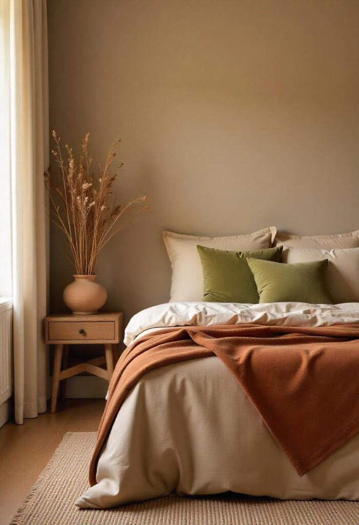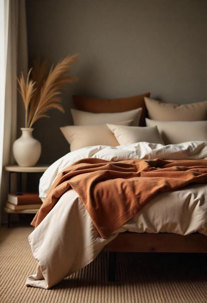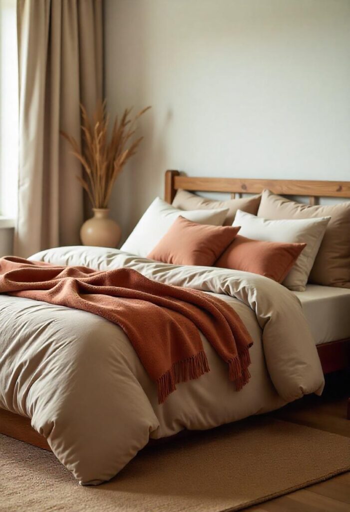 2. Layered Earth-Toned Bedding That Feels Lived In