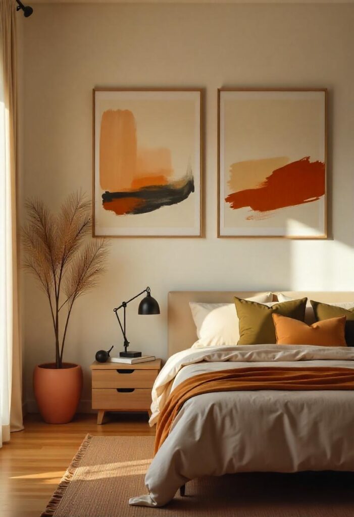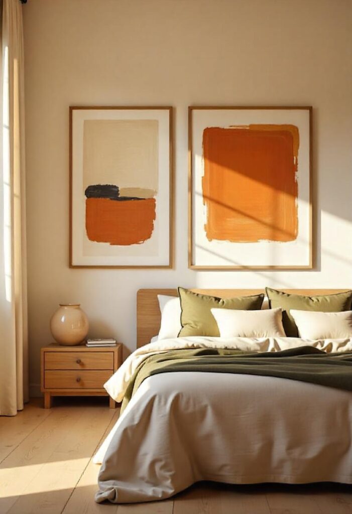 Wall art in muted earth tones can support the bedroom’s material palette. Abstract compositions in sienna, ochre, and charcoal work especially well. Frames in maple, walnut, or oak blend naturally with most wood furniture. Arranged above the bed or across a main wall, they contribute to spatial balance. Use two or three pieces rather than a gallery layout. Art placement should reflect the horizontal rhythm of the bed.