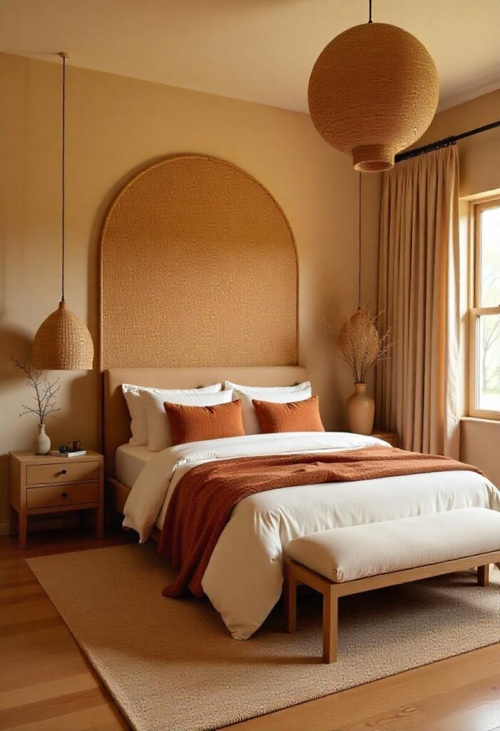 Woven wall panels create vertical texture while staying within the natural material range. These panels may be framed behind the bed or span the entire wall. Bedding in caramel, almond, and stone tones complements this effect. Woven pieces also reduce the need for additional wall art. Combine them with jute flooring and ceramic accessories to unify the room. The result is a tactile environment with quiet depth.
