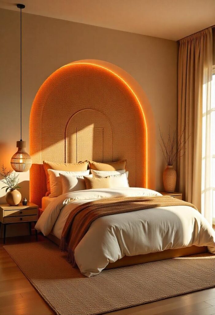 Rounded forms introduce spatial calm and visual softness into the bedroom. A curved headboard in suede or velvet serves as a focal point. Other circular elements may include mirrors, light fixtures, or nightstands. These shapes contrast well with linear walls and rectangular layouts. Arches and curves direct the eye gently across the room. This approach supports a fluid and restful visual flow.