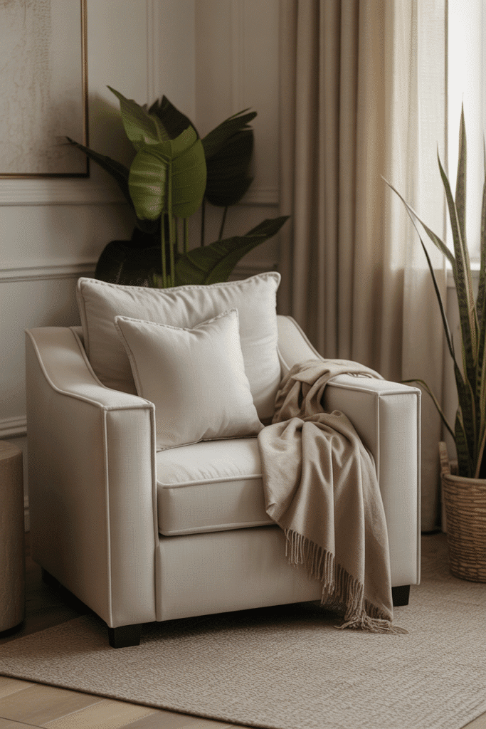 To truly enjoy your cozy corner, you need a comfortable spot to sit, relax, or even nap. Choose a deep, cushioned chair or loveseat that provides ample support while still being inviting. Look for pieces that are both stylish and functional, with wide armrests and a soft, supportive back. A chair that cradles you comfortably can make a huge difference in how you use your space. If you’re not sure about the type of seating to choose, consider a piece that offers both comfort and versatility, like an armchair that can easily transition from reading to napping. Upholstery material, such as linen or faux suede, can further elevate the overall cozy vibe.