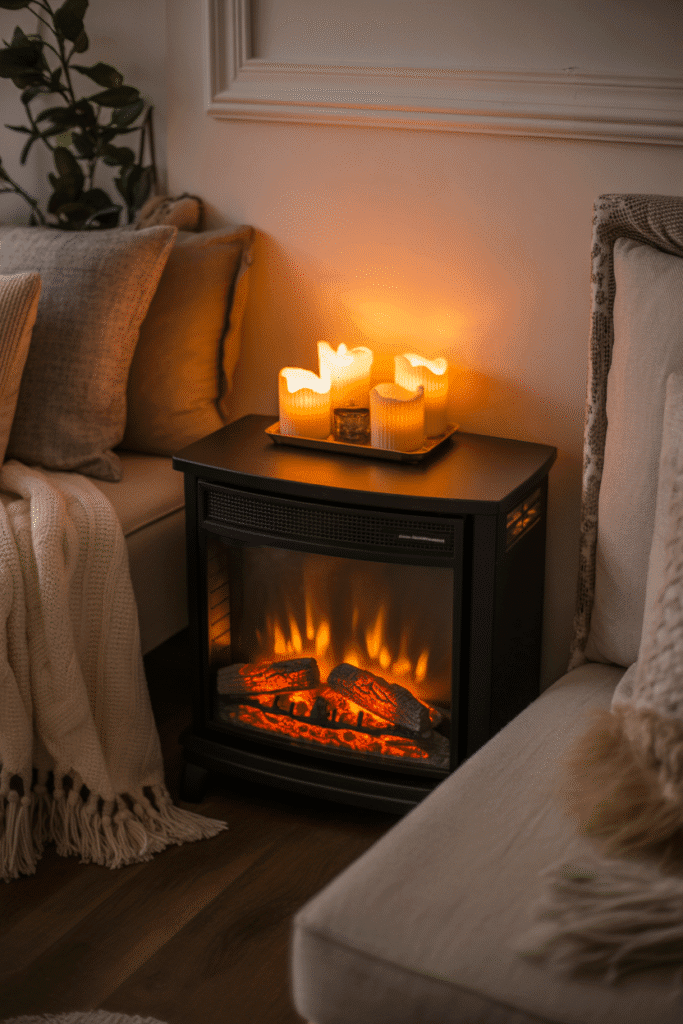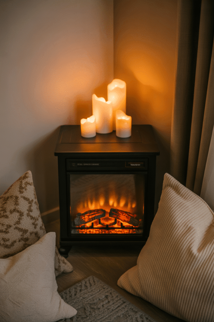 A fire element, whether real or artificial, can instantly make your cozy corner feel more inviting and warm. An electric fireplace provides the look and feel of a real fire without the mess or maintenance, creating a soothing ambiance with the flicker of flames. If you don’t have space for a full fireplace, consider a small space heater with a decorative fire feature, or simply place candles around the area to replicate the comforting glow of a fire. The gentle warmth and the soft flickering light will make your corner feel even more like a personal retreat, perfect for chilly nights.