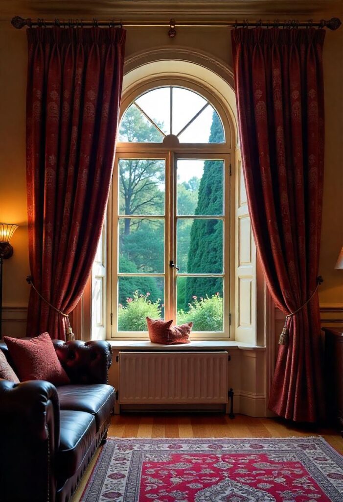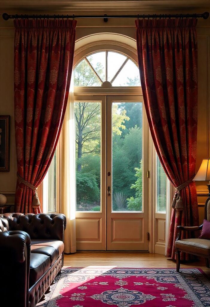 These thick, ornamental curtains feature woven patterns reminiscent of classical textiles. The fabric is firm and carries complex visual detail. Often used to frame large windows in rooms with strong architectural elements. The finish tends to be matte, helping balance the ornate design. These panels convey strength and refinement in equal measure.