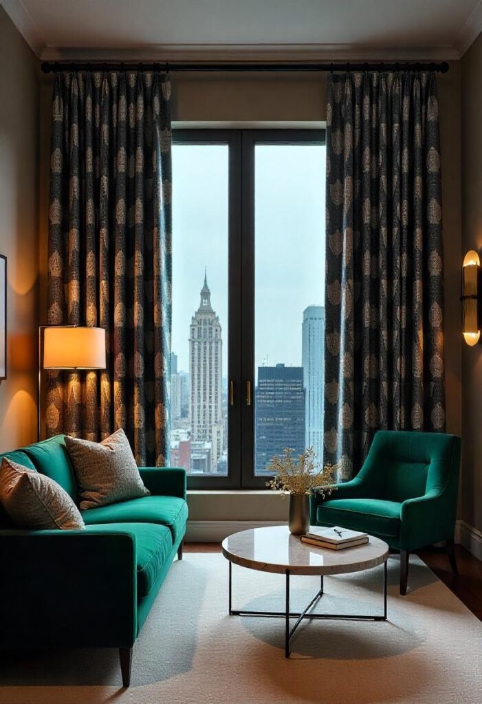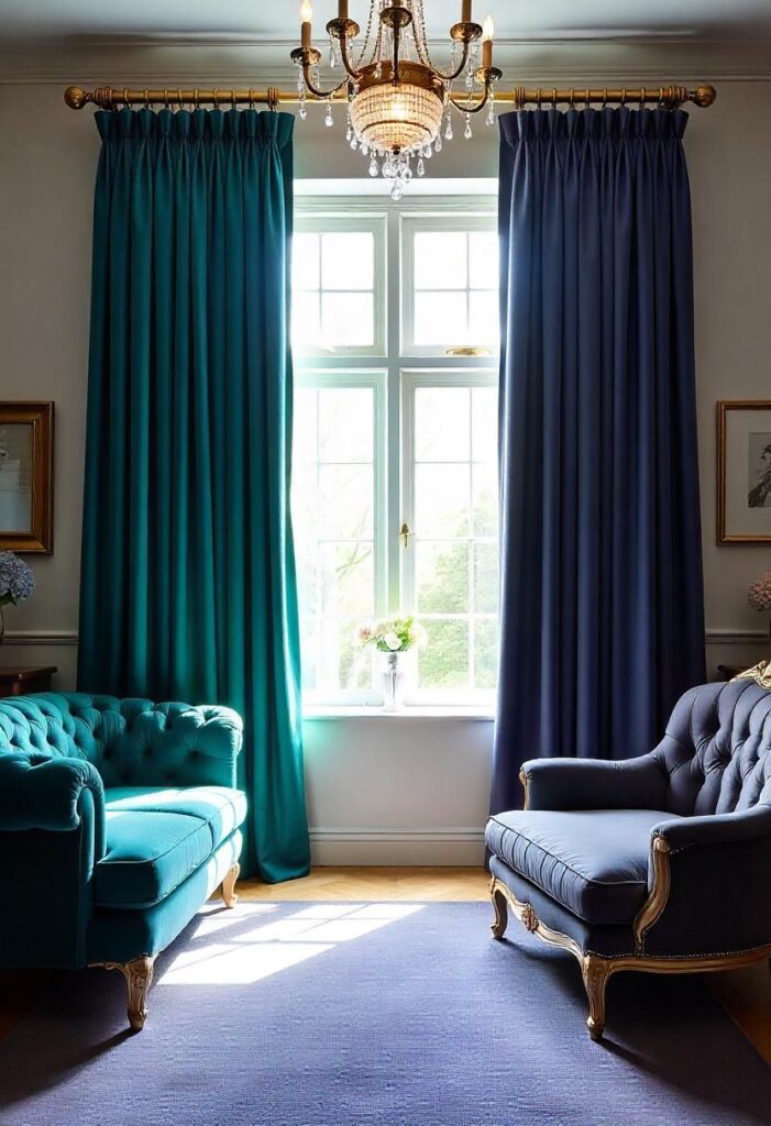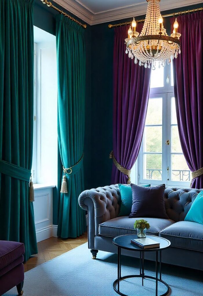 Richly colored velvet curtains reflect the tones of precious stones like sapphire and emerald. The plush surface reacts beautifully to changing light. These panels are often used to create a focal point in formal living rooms. The weight of the fabric enhances the folds and structure. A refined style that introduces color without relying on prints.